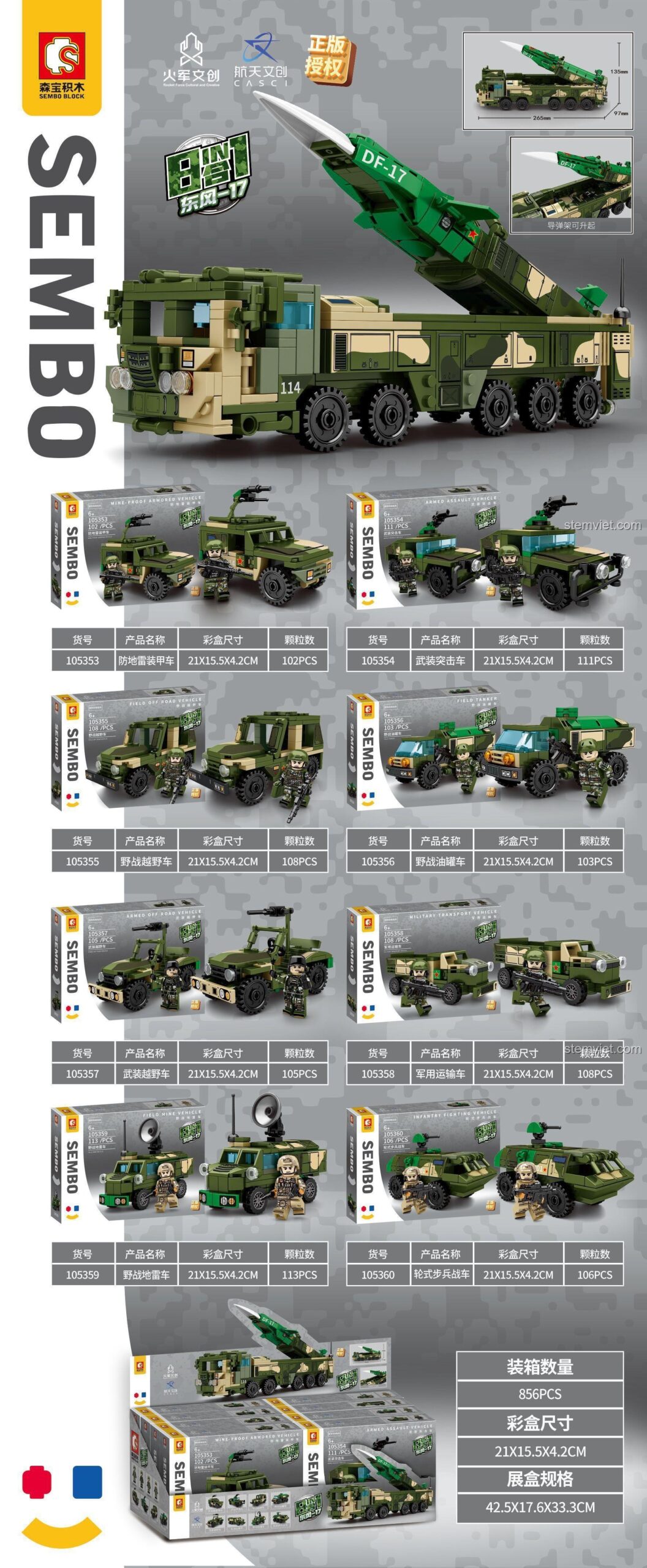 Bộ lắp ghép SEMBO 105353 cho phép bé lắp ráp thành 8 mẫu xe quân sự khác nhau, bao gồm cả mẫu xe tên lửa DF-17 chủ lực.