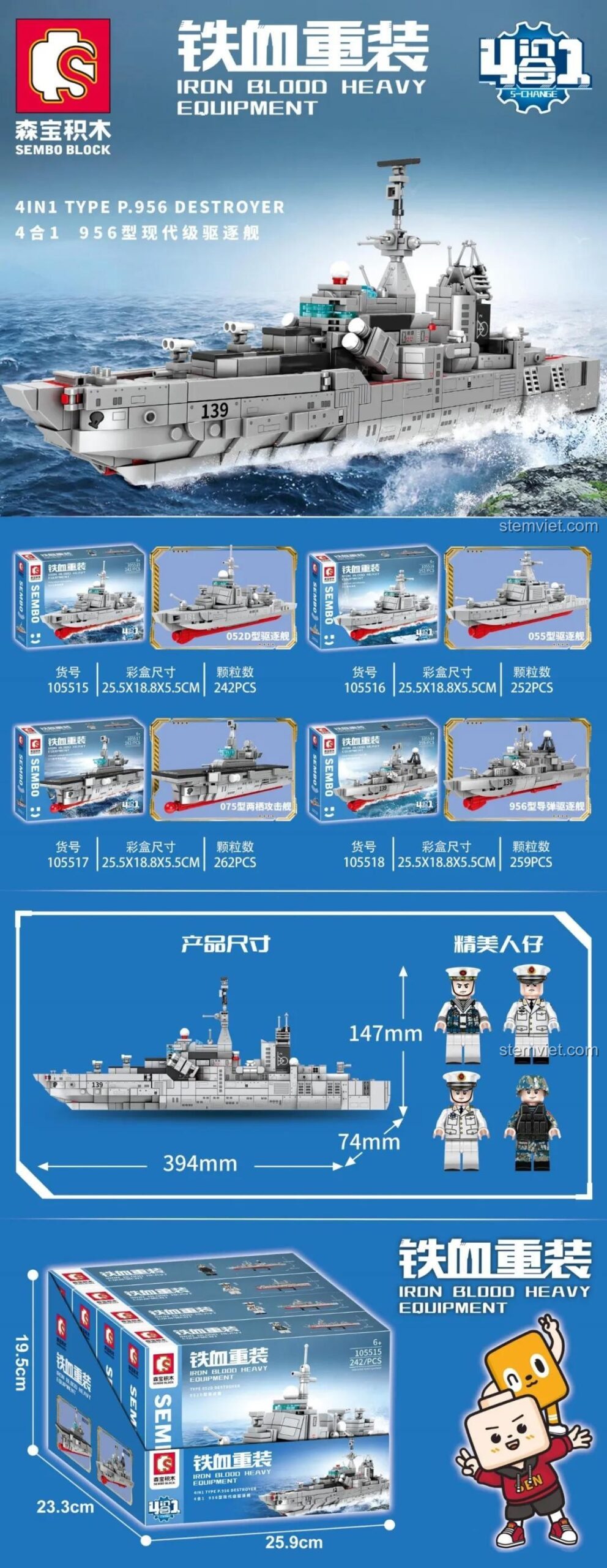 Điểm đặc biệt nhất của bộ đồ chơi SEMBO 105515 là khả năng lắp ráp thành 4 mẫu tàu khu trục khác nhau, mang đến sự đa dạng và hứng thú cho người chơi.