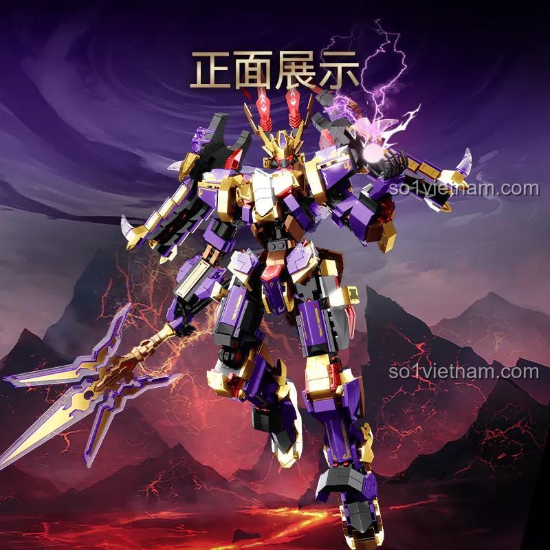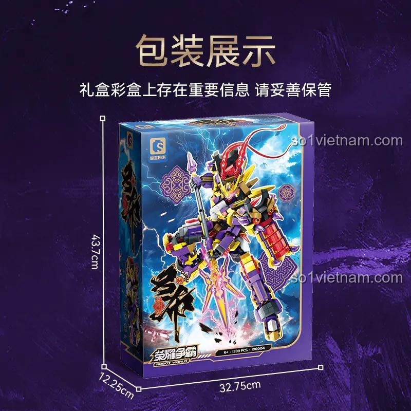 Bộ đồ chơi lắp ráp Mecha Lữ Bố SEMBO 106004 gây ấn tượng mạnh mẽ với thiết kế chi tiết và màu sắc chủ đạo Tím, Vàng, Đen, Đỏ đầy uy lực. Với chiều cao mô hình lên đến 34.5 cm, đây là một mô hình mecha Lữ Bố hoành tráng, xứng đáng là trung tâm của mọi bộ sưu tập. Từng mảnh ghép được chăm chút tỉ mỉ, tái hiện chân thực giáp chiến đấu cơ khí của Lữ Bố, từ phần đầu với mũ trụ đặc trưng cho đến các chi tiết giáp vai, giáp tay và chân. Vũ khí Phương Thiên Họa Kích đi kèm được thiết kế độc lập, sắc sảo, tăng thêm vẻ dũng mãnh cho chiến thần. Bé trai 6 tuổi sẽ vô cùng thích thú khi chiêm ngưỡng thành quả của mình – một Robot Lữ Bố 106004 không chỉ đẹp mắt mà còn thể hiện sự tinh xảo trong từng đường nét, kích thích cảm nhận thẩm mỹ và sự tập trung chi tiết.