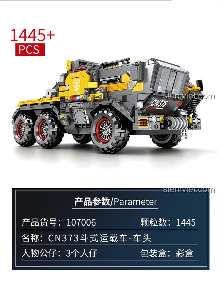 Màu sắc chủ đạo của mô hình là sự kết hợp tinh tế giữa Xám, Vàng và Đen. Màu xám mang lại vẻ ngoài cứng cáp, công nghiệp, trong khi màu vàng tạo điểm nhấn nổi bật, thể hiện các bộ phận chức năng quan trọng. Màu đen được sử dụng để làm nổi bật các chi tiết cơ khí và tạo chiều sâu cho tổng thể. Từng mảnh ghép được gia công tỉ mỉ, đảm bảo độ chính xác cao khi lắp ráp, giúp mô hình hoàn thiện có độ chi tiết tinh xảo. Các bánh xe lớn, hệ thống treo giả lập và cabin lái được thiết kế chân thực, mang đến cảm giác như đang điều khiển một chiếc xe vận tải thực thụ. Đây chắc chắn là một **bộ lắp ghép 006** sẽ khiến bất kỳ ai yêu thích xe cộ và khoa học viễn tưởng đều phải trầm trồ.