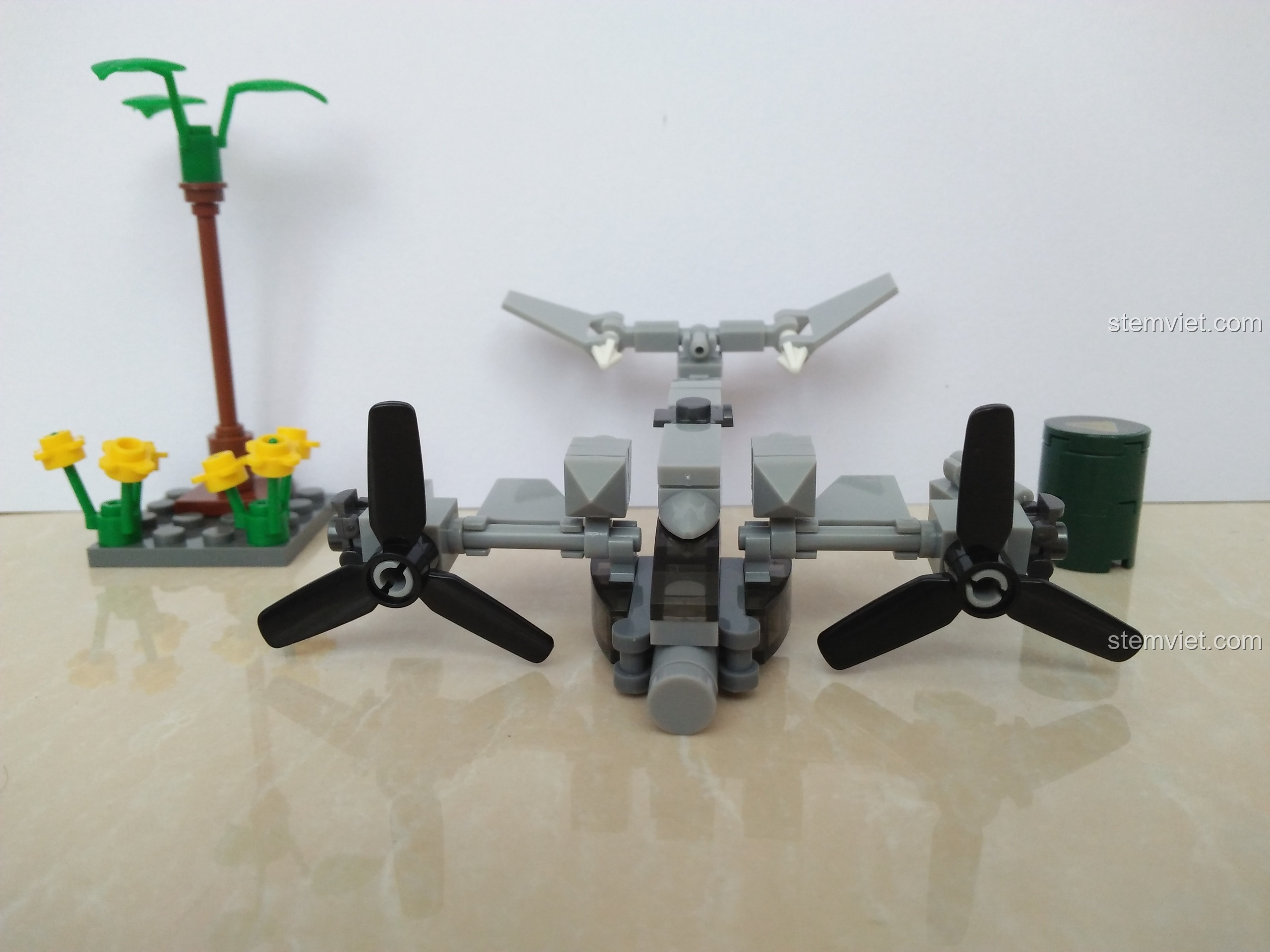 Bé có thể làm theo sách hướng dẫn đi kèm để tháo rời các chi tiết của cả ba mô hình và lắp ráp chúng lại thành một siêu phi cơ chiến đấu khổng lồ, hoành tráng hơn rất nhiều. Mô hình hợp thể này là sự kết hợp tinh hoa của cả ba cỗ máy: tốc độ của tiêm kích, sự linh hoạt của trực thăng và hỏa lực mạnh mẽ của các loại vũ khí. Quá trình “biến hình” này không chỉ nhân đôi, nhân ba niềm vui mà còn là một thử thách thú vị, kích thích tư duy logic và khả năng giải quyết vấn đề của bé. Tính năng “3 trong 1” này biến những bộ đồ chơi nhỏ bé, giá rẻ trở thành một món đồ chơi giá trị cao, mang lại trải nghiệm đa dạng và không bao giờ nhàm chán.