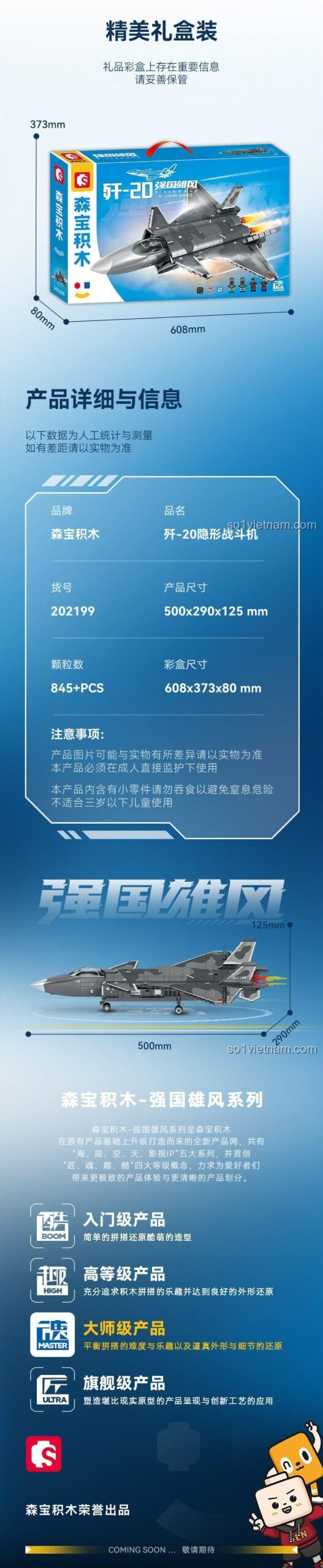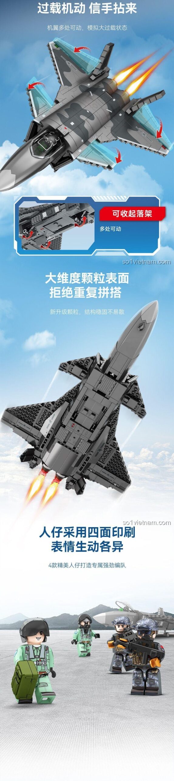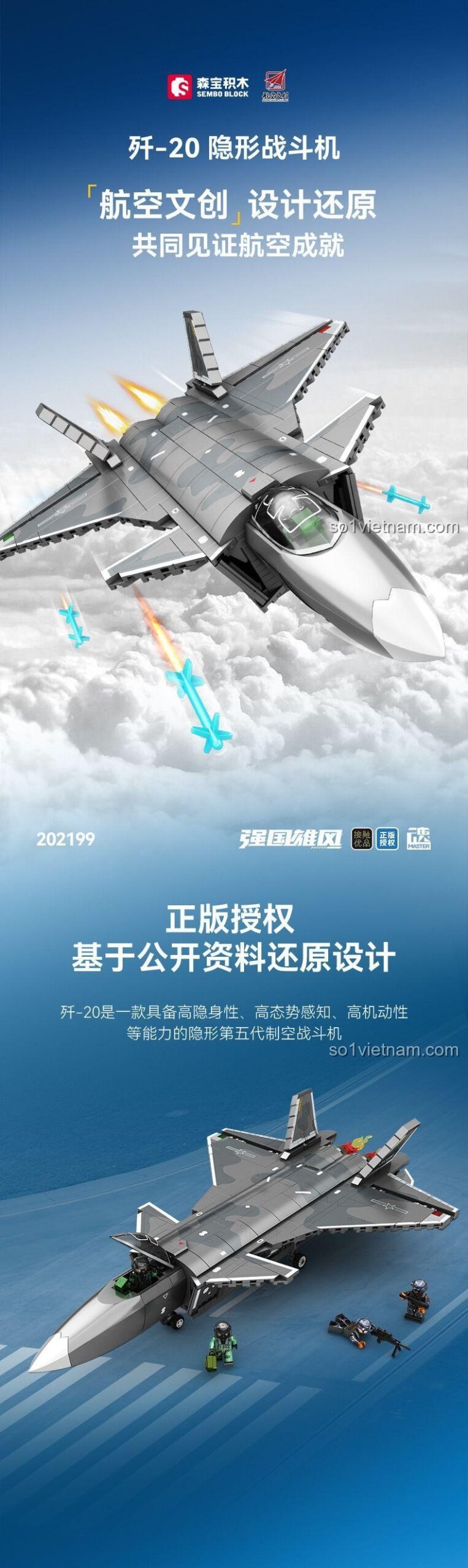 Bộ lắp ghép SEMBO 202199 J-20 Tàng hình nổi bật với tỉ lệ 1:45 chân thực, có đèn LED chiếu sáng, khả năng bắn đạn nhựa, khoang chứa vũ khí có thể mở và 4 minifigures phi công đi kèm.