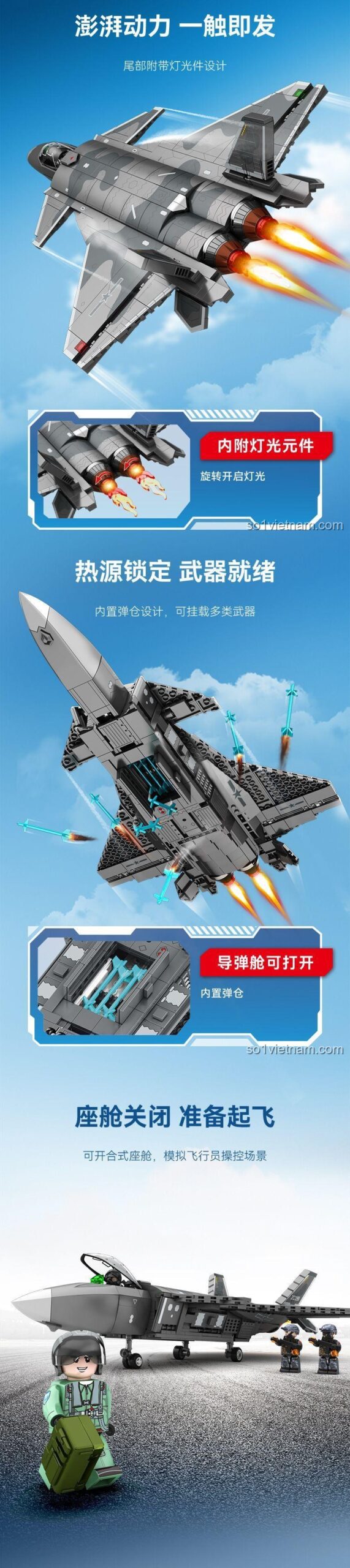 Máy bay chiến đấu J-20, hay còn gọi là “Diệc đen”, là niềm tự hào của ngành công nghiệp hàng không Trung Quốc. Được phát triển như một tiêm kích tàng hình thế hệ thứ năm, J-20 sở hữu những công nghệ tiên tiến nhất, mang lại khả năng chiến đấu vượt trội. Sự ra đời của J-20 đánh dấu một bước tiến quan trọng trong lĩnh vực quân sự, thể hiện sức mạnh và sự phát triển công nghệ của quốc gia. Bộ lắp ghép SEMBO 202199 tái hiện chân thực hình dáng khí động học, các chi tiết tinh xảo của chiếc máy bay huyền thoại này, giúp bé không chỉ được chơi mà còn được tìm hiểu về lịch sử và công nghệ hàng không.