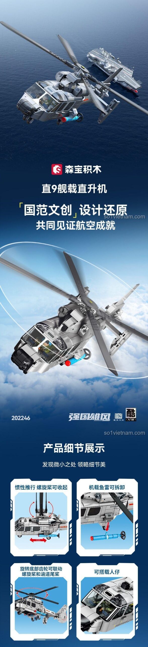 Bộ lắp ghép Trực thăng Hải quân Z-9 SEMBO 20246 có nhiều tính năng hấp dẫn như cánh quạt có thể xoay, vũ khí mô phỏng có thể tháo lắp, khoang lái mở để đặt phi công và cánh quạt có thể gập gọn tiện lợi cho việc trưng bày.