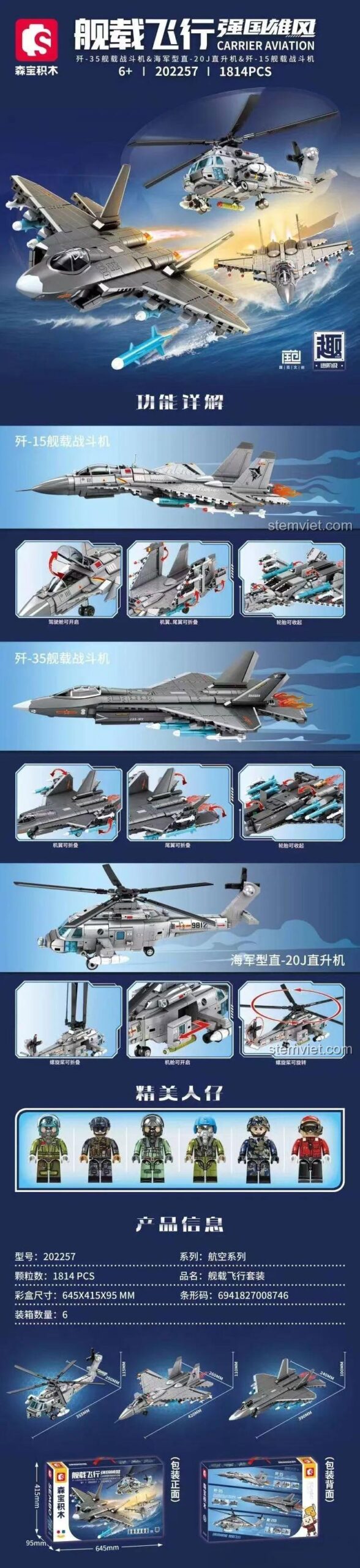 Giải phóng trí tưởng tượng và niềm đam mê không gian của bé với **bộ lắp ráp SEMBO 202257 – Bộ 3 Máy Bay Chiến Đấu Hải Quân**! Với **1814 mảnh ghép** chất lượng cao, bé sẽ tự tay lắp ráp nên 3 mô hình khí tài quân sự hiện đại và oai phong, bao gồm: