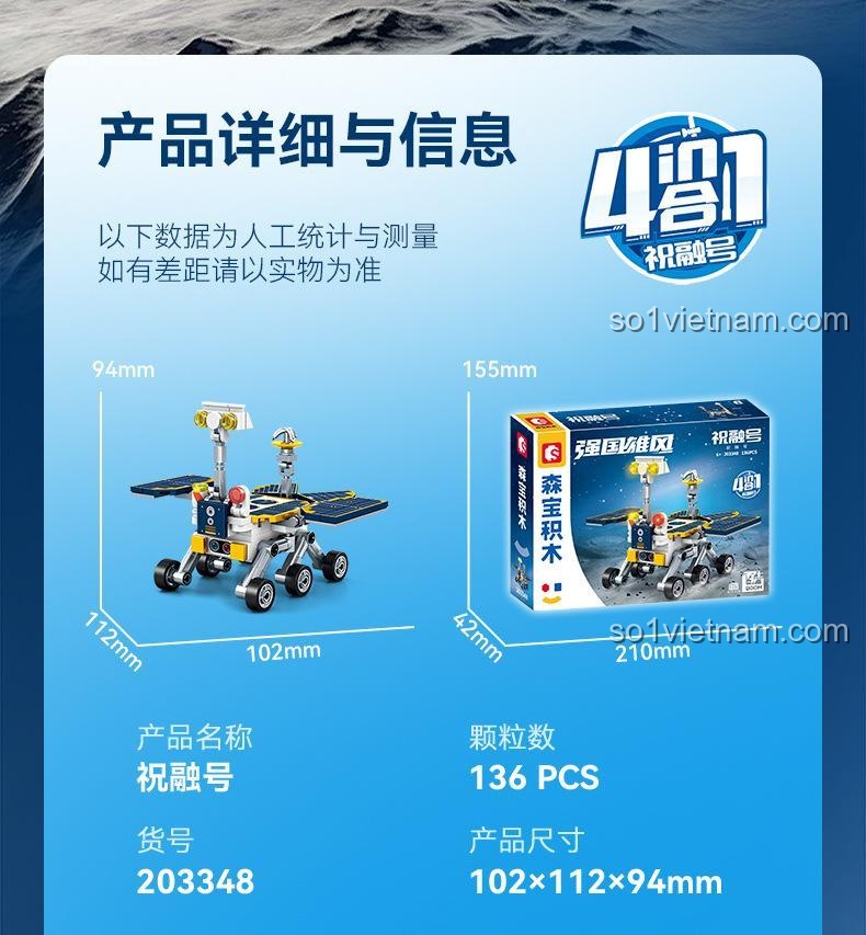 Bộ đồ chơi này có thể lắp được 4 mẫu phương tiện không gian khác nhau, bao gồm Xe Tự Hành Sao Hỏa Chúc Dung, Vệ tinh không gian, Tàu con thoi và Tên lửa vũ trụ. Điều này mang lại sự đa dạng và giá trị chơi cao.