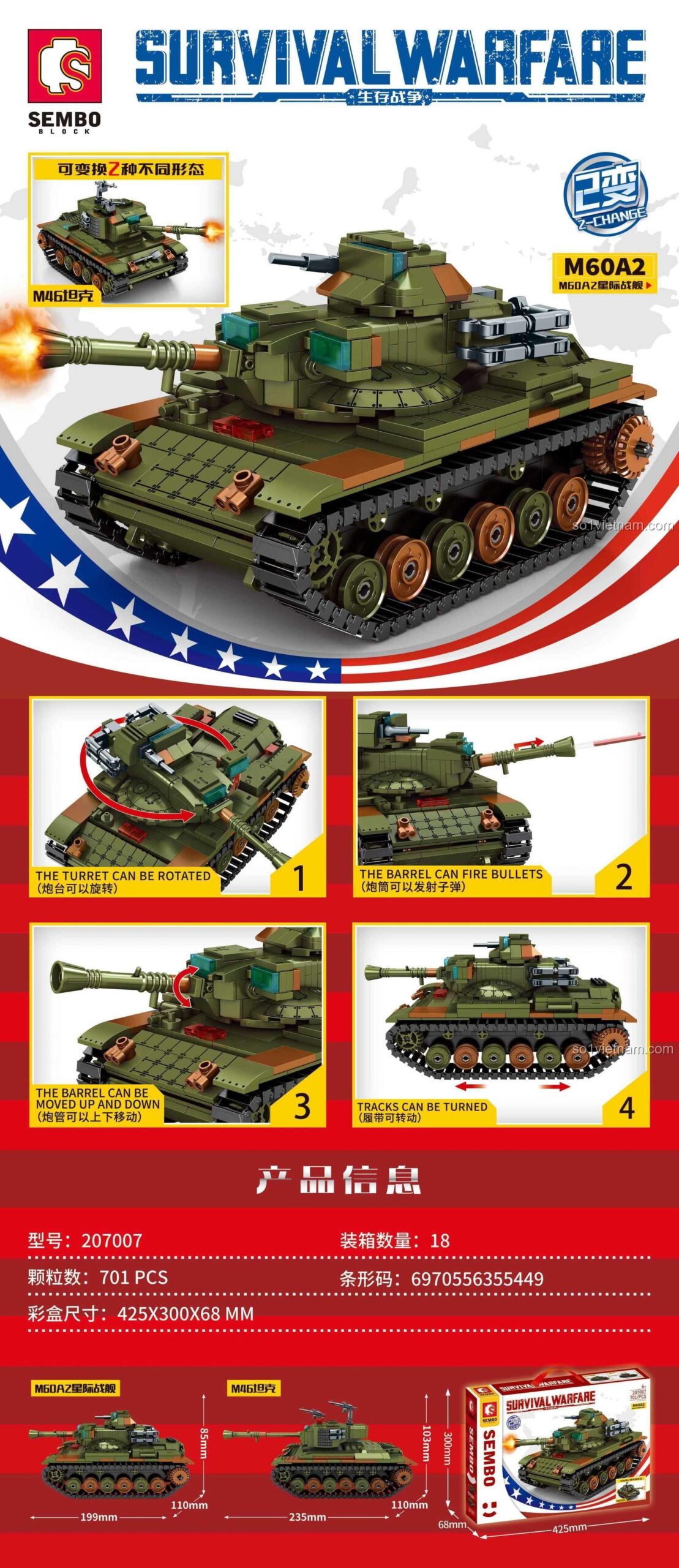 Bộ lắp ghép SEMBO 207007 nổi bật với thiết kế mô phỏng chân thực xe tăng M60A2 “Chiến Hạm Sao Hỏa”. Từng chi tiết nhỏ nhất đều được chăm chút tỉ mỉ, từ hệ thống bánh xích chuyển động linh hoạt, tháp pháo có thể xoay và nâng hạ, cho đến khẩu pháo chính mạnh mẽ.