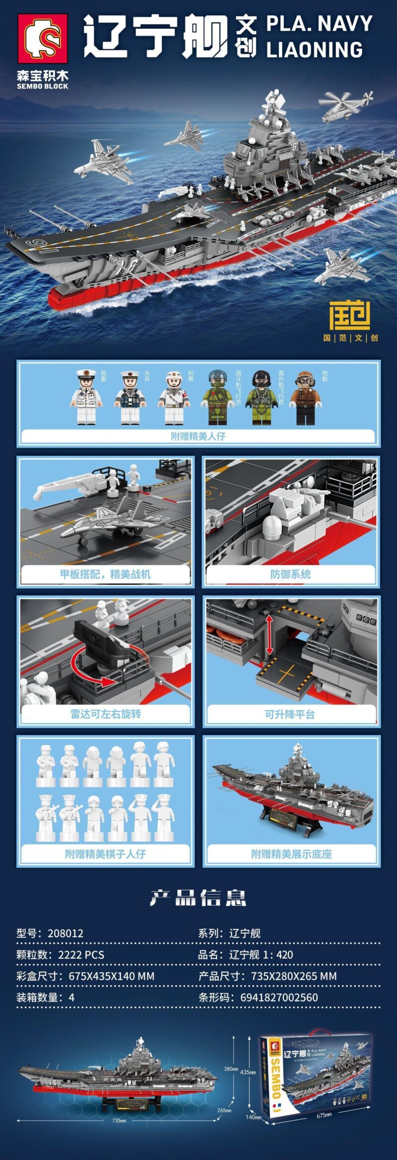 Mô hình Tàu sân bay Liêu Ninh SEMBO 208012 có tổng cộng 2222 mảnh ghép, mang đến một thử thách lắp ráp thú vị và phần thưởng xứng đáng.