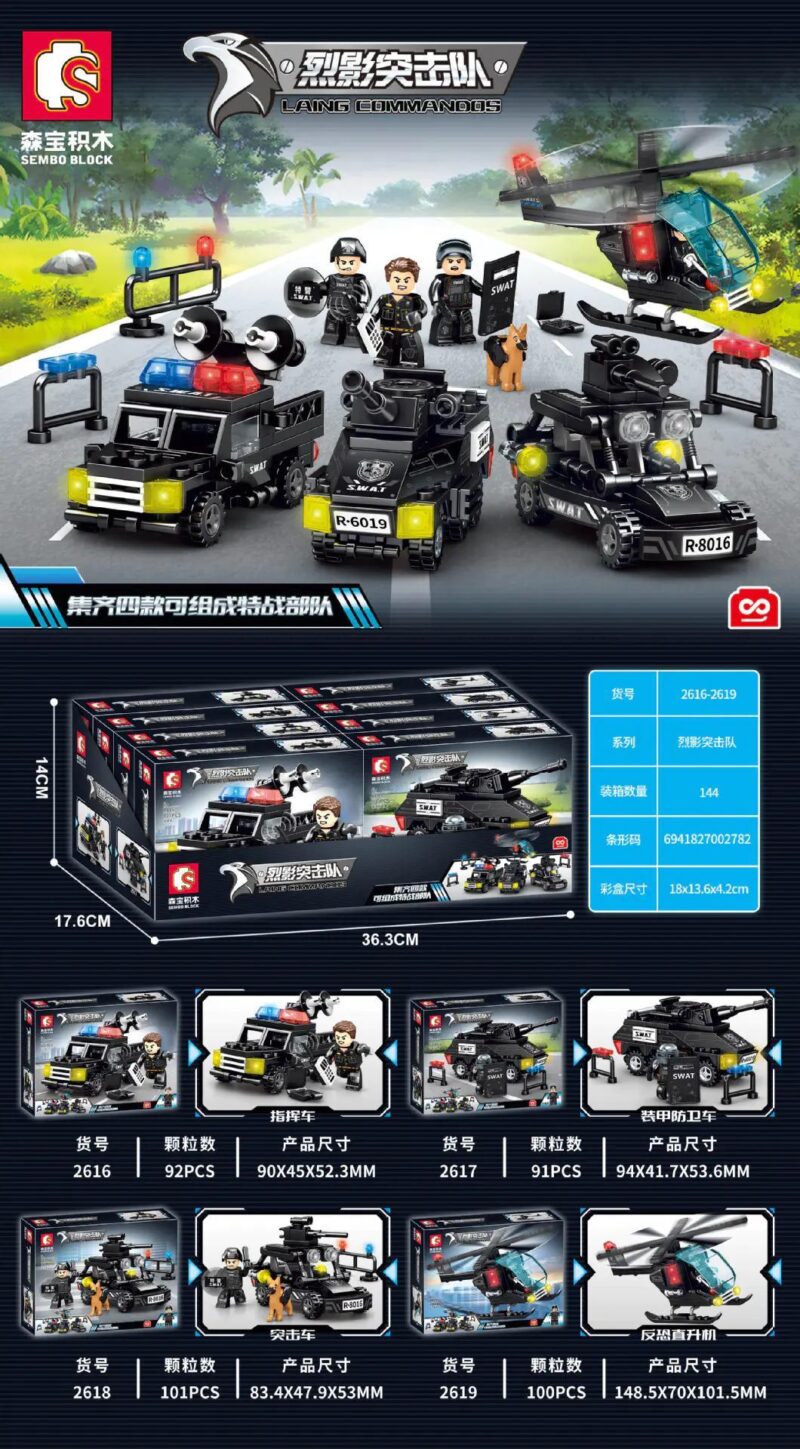 Bộ đồ chơi SEMBO 2616-2619 Laing Commandos – Biệt Đội Tác Chiến là một bộ sưu tập ấn tượng, bao gồm 4 mẫu lắp ráp độc đáo, tái hiện chân thực các phương tiện và nhân vật của lực lượng đặc nhiệm SWAT. Với tổng cộng 384 chi tiết, bé sẽ có cơ hội tự tay xây dựng nên: