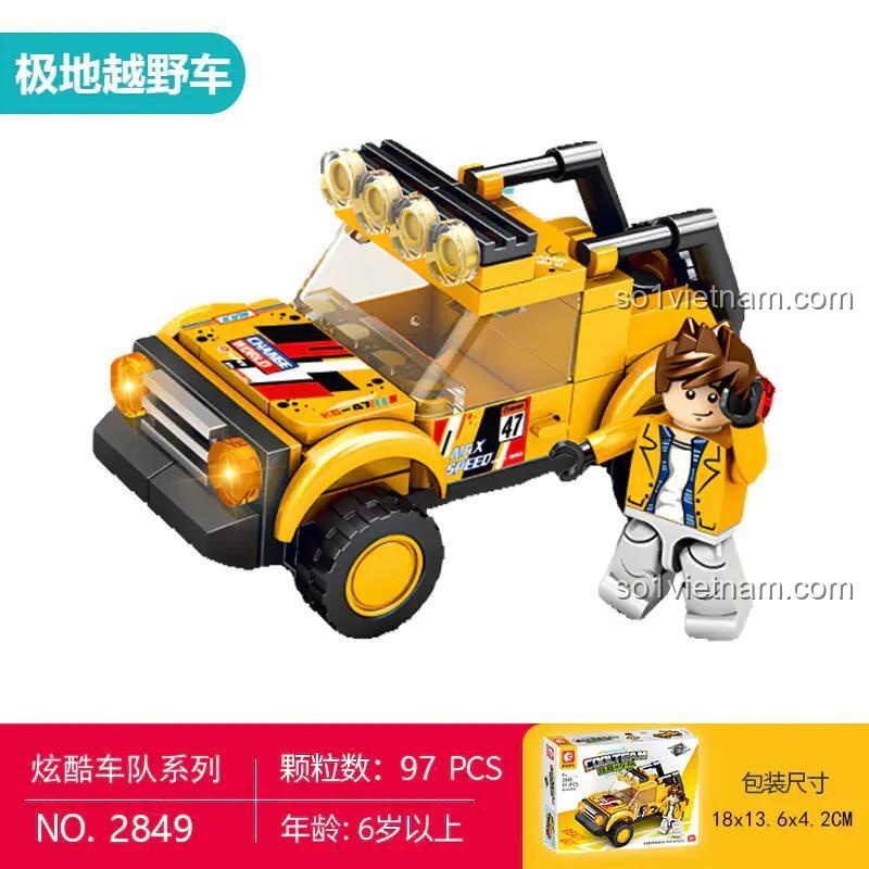 SEMBO 2849 nổi bật với thiết kế xe địa hình hầm hố, màu vàng ấn tượng và đi kèm minifigure, mang đến trải nghiệm lắp ráp thú vị với mức giá tiết kiệm hơn đáng kể so với LEGO®.