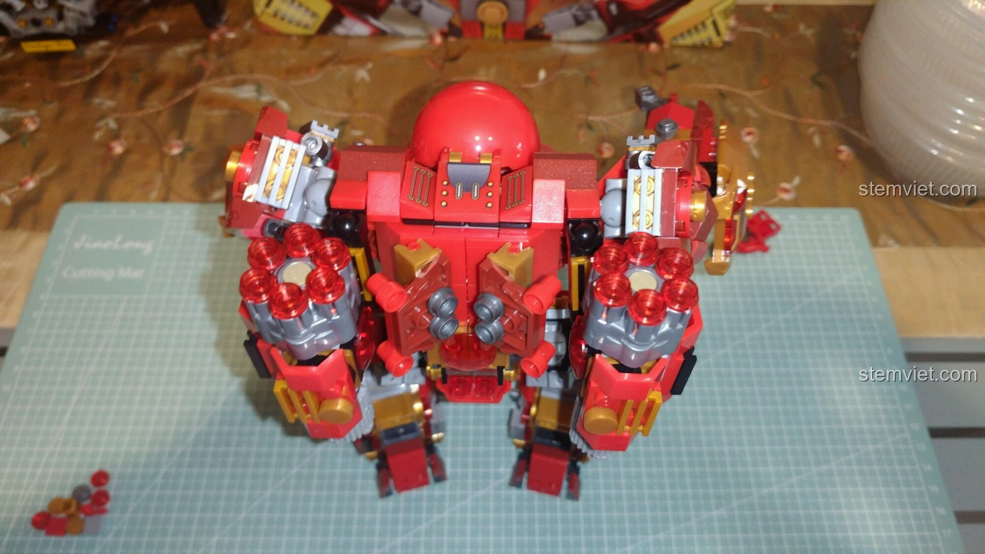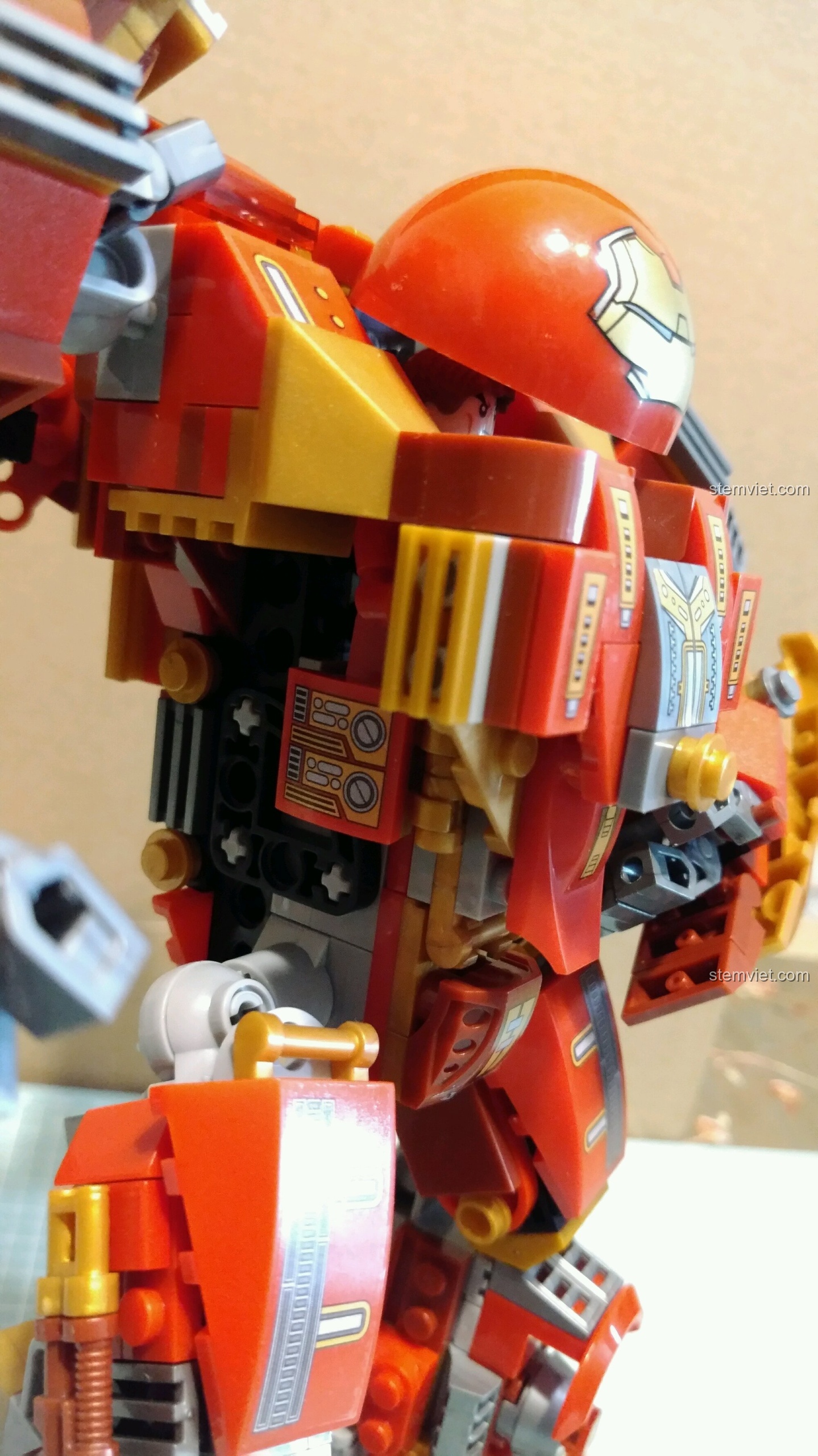 Ngay từ cái nhìn đầu tiên, Robot Hulkbuster MK44 SEMBO đã gây ấn tượng mạnh mẽ với thiết kế cực kỳ hầm hố và chi tiết. Tông màu đỏ-vàng-xám đặc trưng của Iron Man được tái hiện một cách sống động, kết hợp với những tấm decal tinh xảo, mang lại một vẻ ngoài chân thực đến kinh ngạc. Từng đường nét, từ phần đầu hình vòm, tấm ngực dày dặn cho đến đôi chân vững chãi, tất cả đều được chăm chút tỉ mỉ để tạo nên một tổng thể mạnh mẽ, sẵn sàng cho mọi cuộc chiến. Các chi tiết cơ khí, ống dẫn năng lượng và các tấm giáp được mô phỏng sắc nét, tạo cảm giác đây là một cỗ máy chiến đấu thực thụ. Đặc biệt, các khớp nối được thiết kế thông minh, không chỉ đảm bảo độ chắc chắn mà còn cho phép mô hình cử động linh hoạt, giúp bé dễ dàng tạo ra những tư thế chiến đấu oai hùng hay những dáng đứng trưng bày ấn tượng. Đây thực sự là một kiệt tác lắp ráp mà bất kỳ fan nhí nào của Marvel cũng ao ước sở hữu.