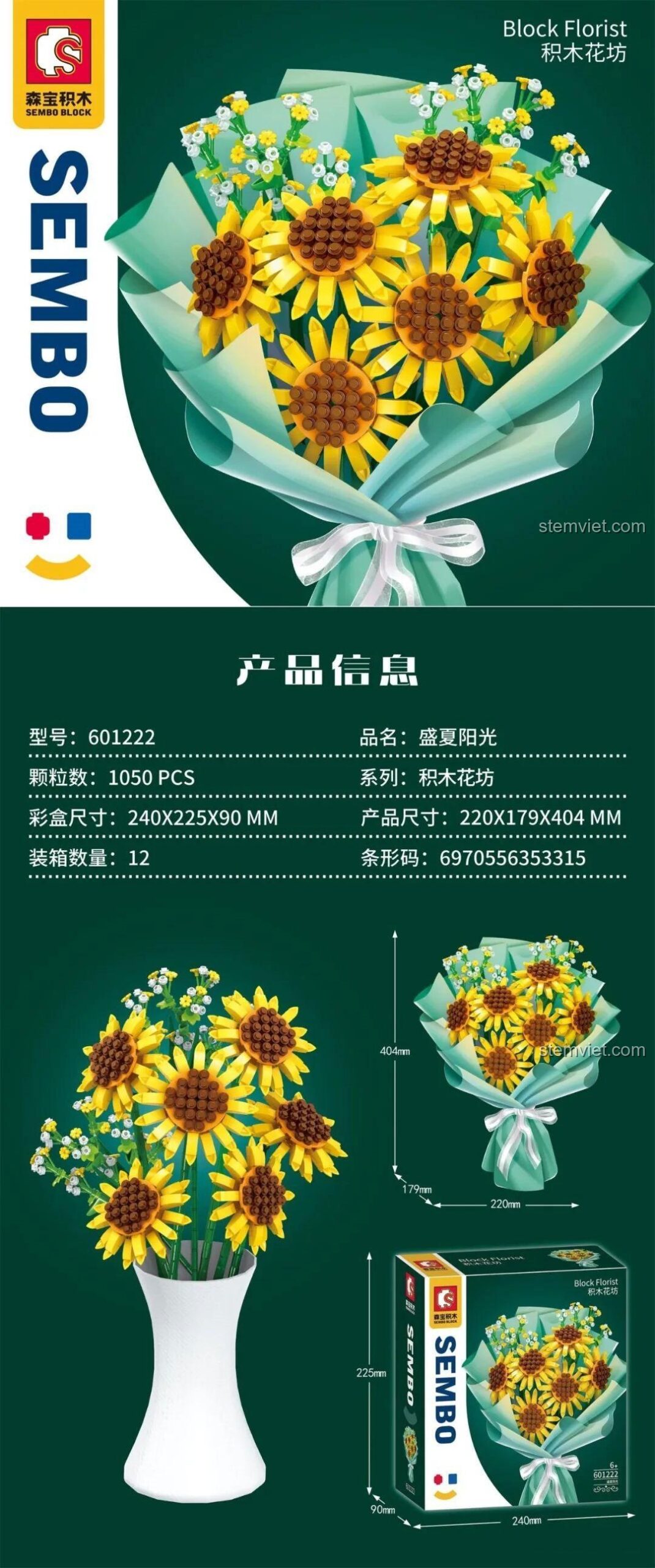 Bộ lắp ghép SEMBO 601222 mang đến một bó hoa hướng dương sống động, với những cánh hoa vàng rực rỡ, nhụy hoa nâu tinh xảo và những chiếc lá xanh mướt, tất cả được gói ghém cẩn thận trong giấy gói màu xanh ngọc bích dịu mát. Từng chi tiết nhỏ đều được thiết kế tỉ mỉ, mô phỏng chân thực vẻ đẹp của những đóa hướng dương đang khoe sắc dưới ánh nắng hè.