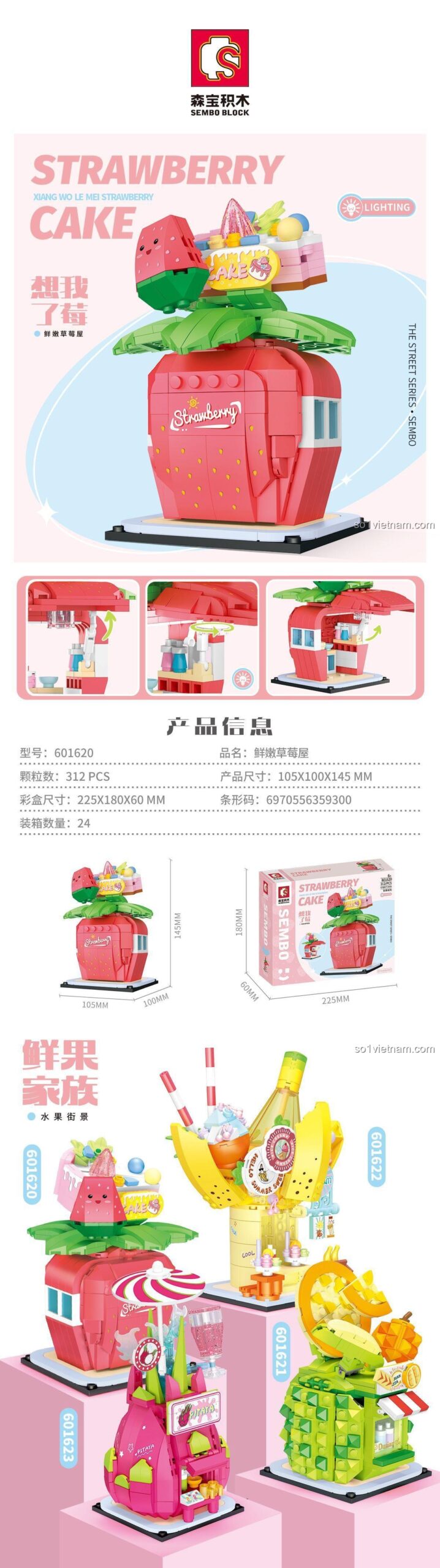 SEMBO 601620 tập trung vào thiết kế mô hình dâu tây độc đáo và các chi tiết trang trí bánh ngọt, mang lại trải nghiệm lắp ráp và trưng bày thú vị.