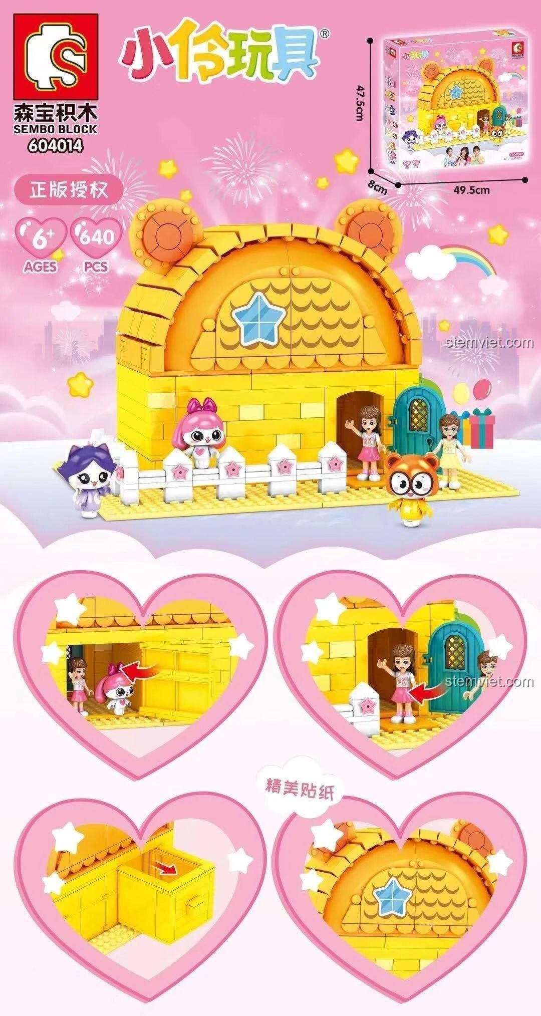 Ngôi nhà nhỏ trong bộ SEMBO 604014 nổi bật với tông màu vàng chủ đạo, mang lại cảm giác ấm áp và tươi vui. Thiết kế chi tiết, tỉ mỉ đến từng đường nét, từ mái nhà hình tai gấu ngộ nghĩnh đến ô cửa xanh xinh xắn, tất cả đều được tái hiện một cách sống động. Bộ sản phẩm còn đi kèm 3 nhân vật đáng yêu: một cô bé năng động, một chú mèo tinh nghịch và một bạn gấu trúc dễ thương, sẵn sàng cùng bé tạo nên những câu chuyện cổ tích của riêng mình.