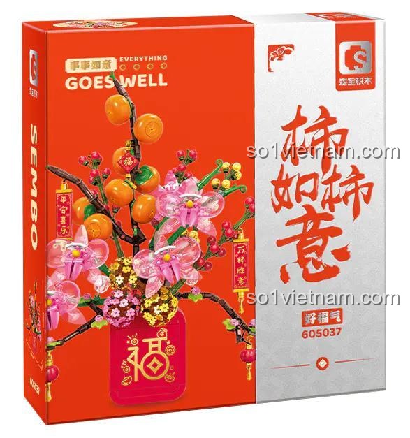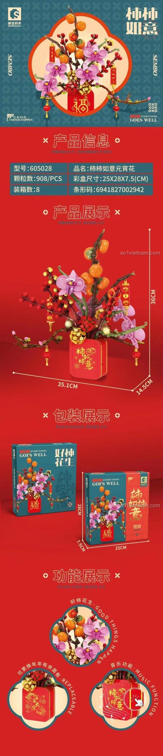 Bộ lắp ráp SEMBO 605037 Cây Quất Tài Lộc Tết bao gồm 908 chi tiết.
