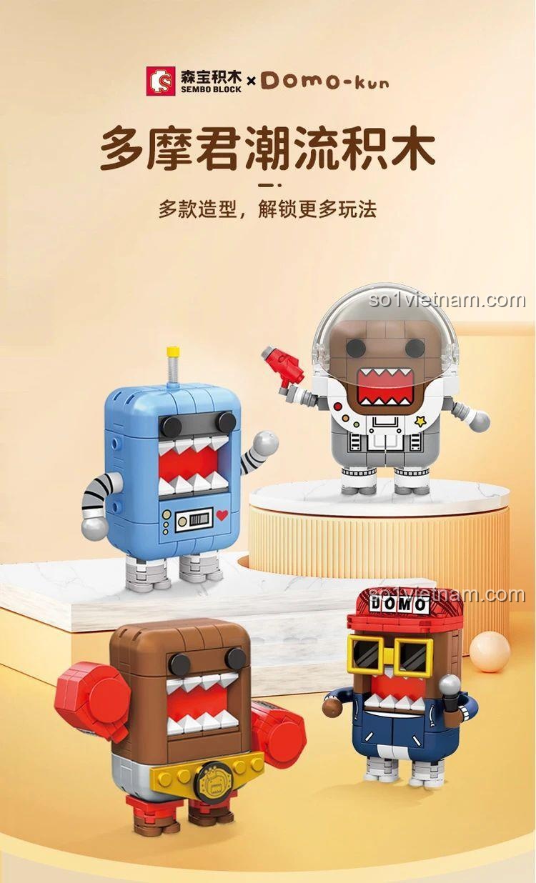 Bộ SEMBO 612501 Domo-Kun Phi Hành Gia cho phép bé lắp ráp thành 4 tạo hình khác nhau: Phi hành gia, Rapper, Võ sĩ quyền Anh và Người máy.
