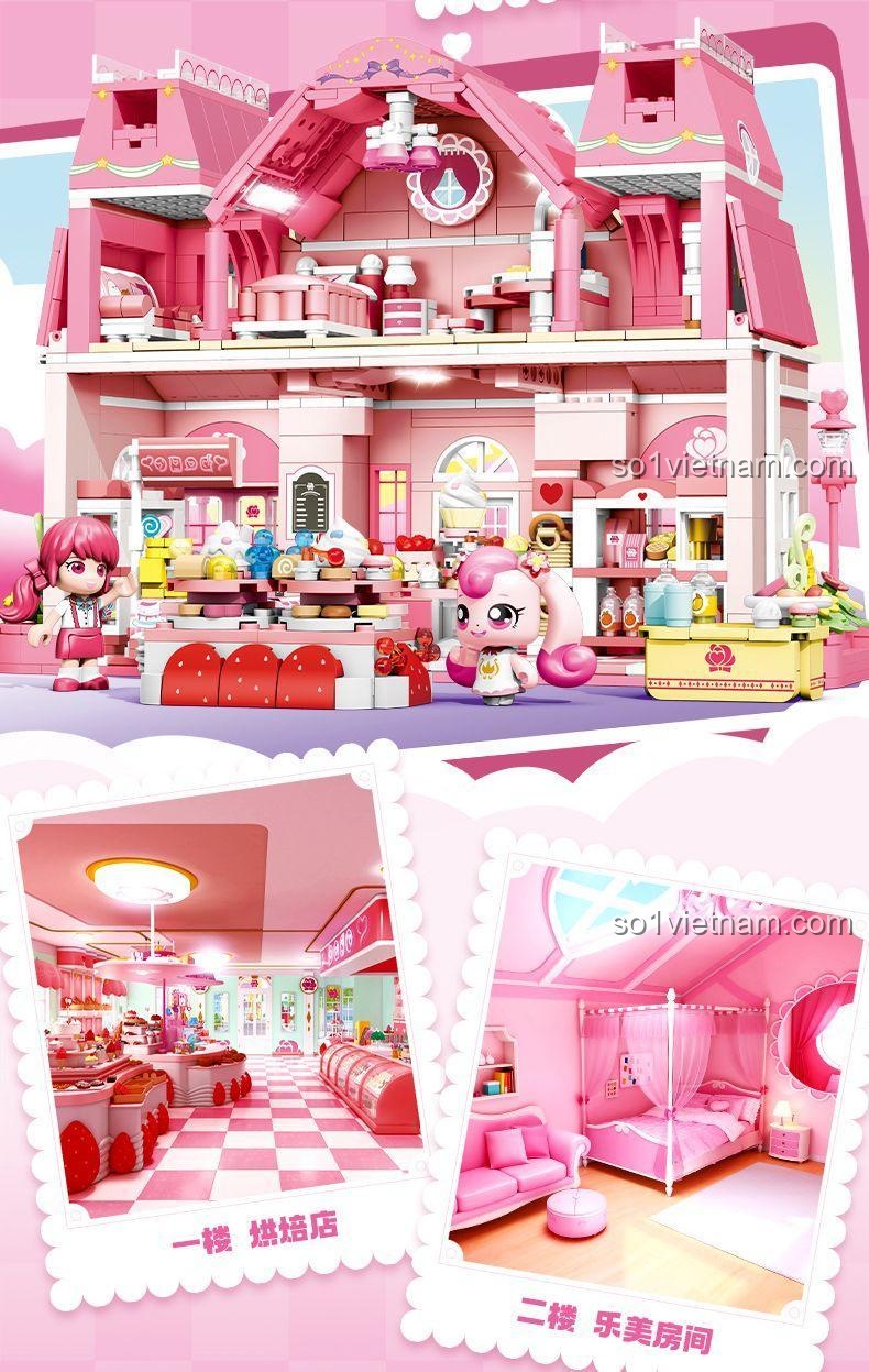 - Tầng trệt: Tiệm Bánh Ngọt – Nơi trưng bày những chiếc bánh kem, bánh cupcake và các loại đồ uống hấp dẫn. Quầy bánh được thiết kế tỉ mỉ với các chi tiết như tủ kính, kệ trưng bày, máy pha chế và cả một chiếc máy nướng bánh nhỏ xinh. Cửa chính có thể mở ra, mời gọi những vị khách nhí ghé thăm.