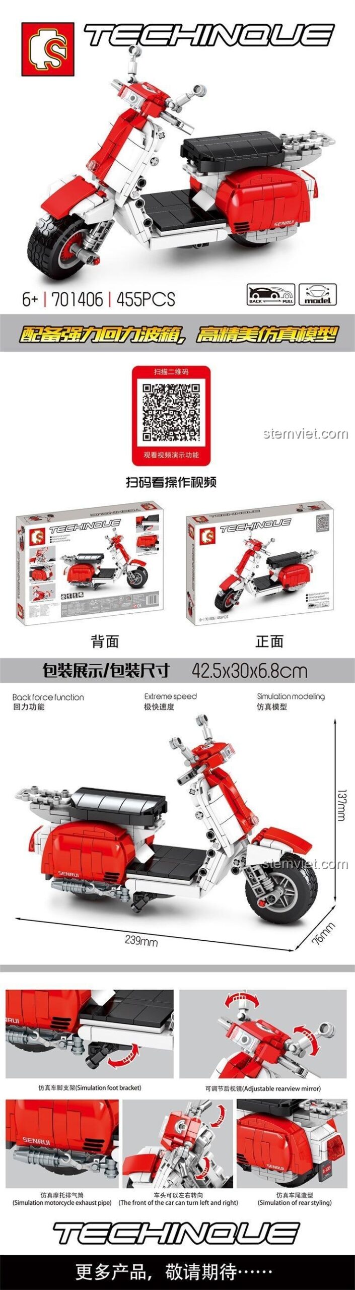 Ngay từ cái nhìn đầu tiên, mô hình Vespa này đã chinh phục mọi ánh nhìn bởi vẻ ngoài quá đỗi chân thực và cuốn hút. Từng đường cong mềm mại, từng chi tiết đặc trưng của dòng xe Vespa cổ điển đều được tái hiện một cách tỉ mỉ đến kinh ngạc. Với tông màu Đỏ – Trắng – Đen kết hợp hài hòa, chiếc xe toát lên vẻ năng động, trẻ trung nhưng không kém phần sang trọng. Kích thước sau khi hoàn thiện dài 23.9 cm, cao 13.7 cm, theo tỉ lệ 1:8 so với xe thật, tạo nên một mô hình trưng bày vô cùng ấn tượng. Chị và bé sẽ phải trầm trồ trước những chi tiết nhỏ nhưng ‘có võ’ như yên xe bọc da, tay lái, gương chiếu hậu, đèn pha tròn cổ điển, và cả chiếc chân chống có thể gạt lên xuống như thật. Mỗi một chi tiết đều được chăm chút kỹ lưỡng, biến bộ xếp hình 701406 thành một tác phẩm nghệ thuật thực thụ, chứ không đơn thuần là một món đồ chơi.