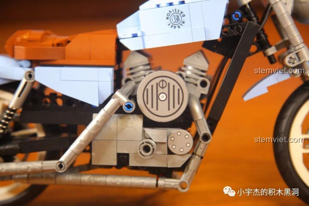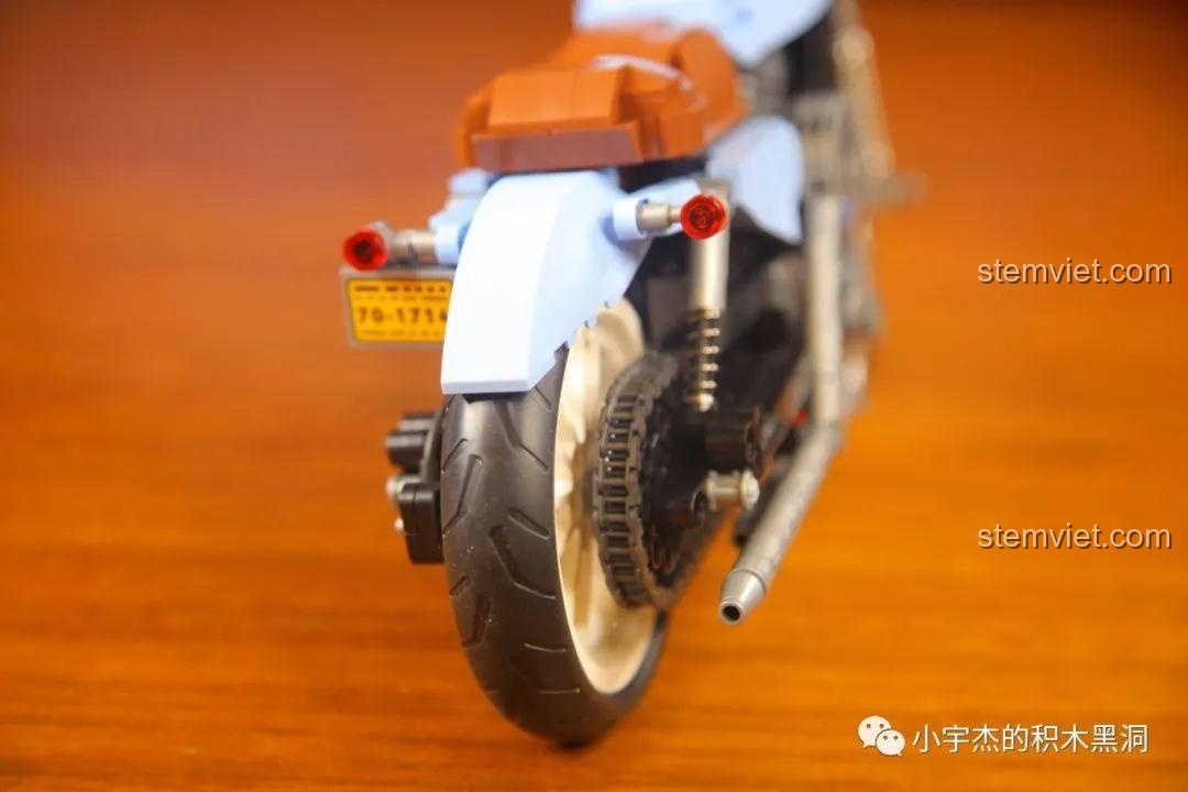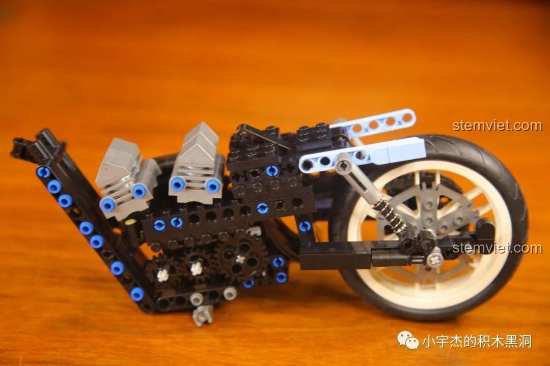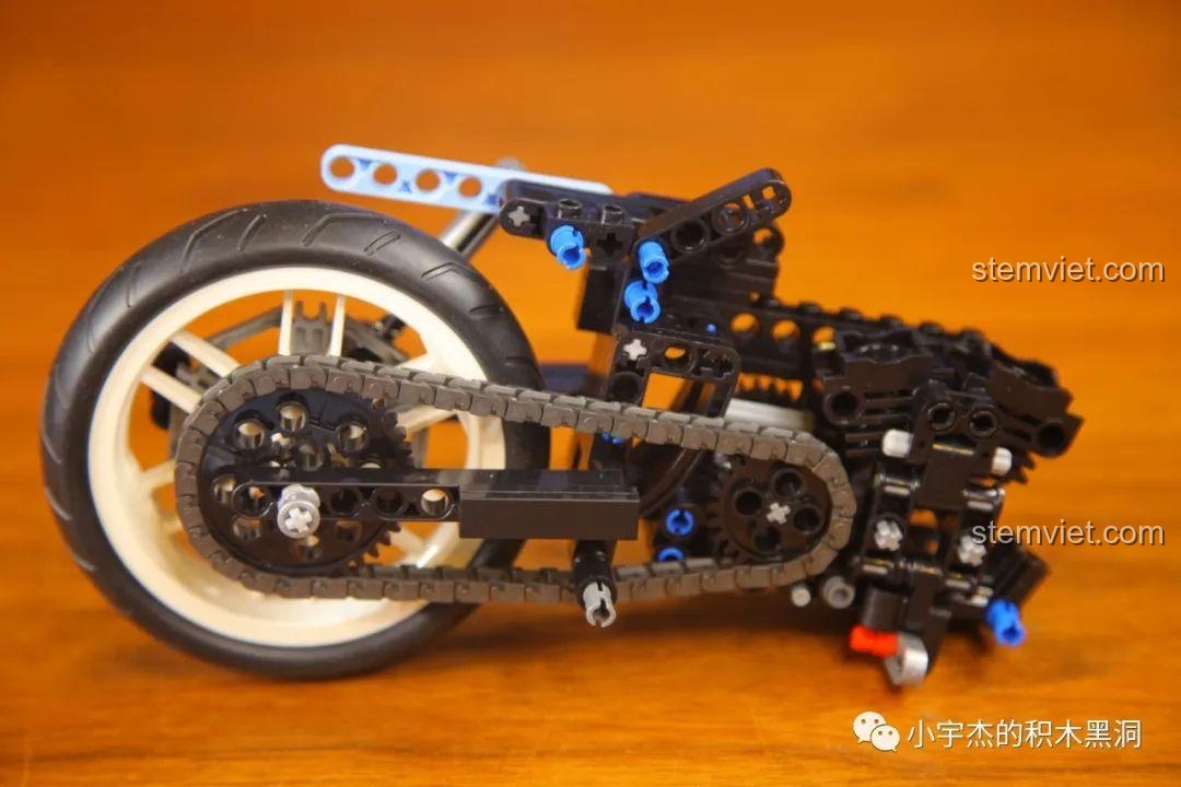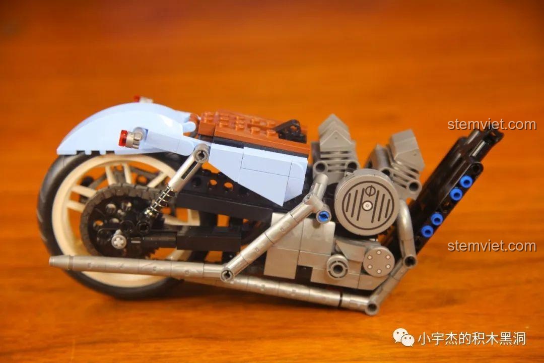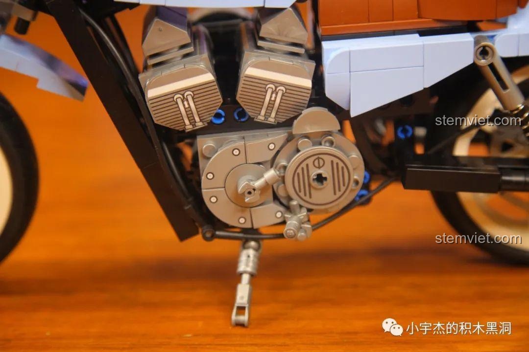 Động cơ của bộ xếp hình 701714 không chạy bằng pin nhưng có cơ chế hoạt động cơ học rất sống động. Khi bánh sau của xe lăn, nó sẽ kéo hệ thống xích và làm cho 2 piston bên trong khối động cơ V-Twin di chuyển lên xuống nhịp nhàng, mô phỏng y hệt nguyên lý hoạt động của một chiếc xe thật, mang lại trải nghiệm vô cùng thú vị cho bé.