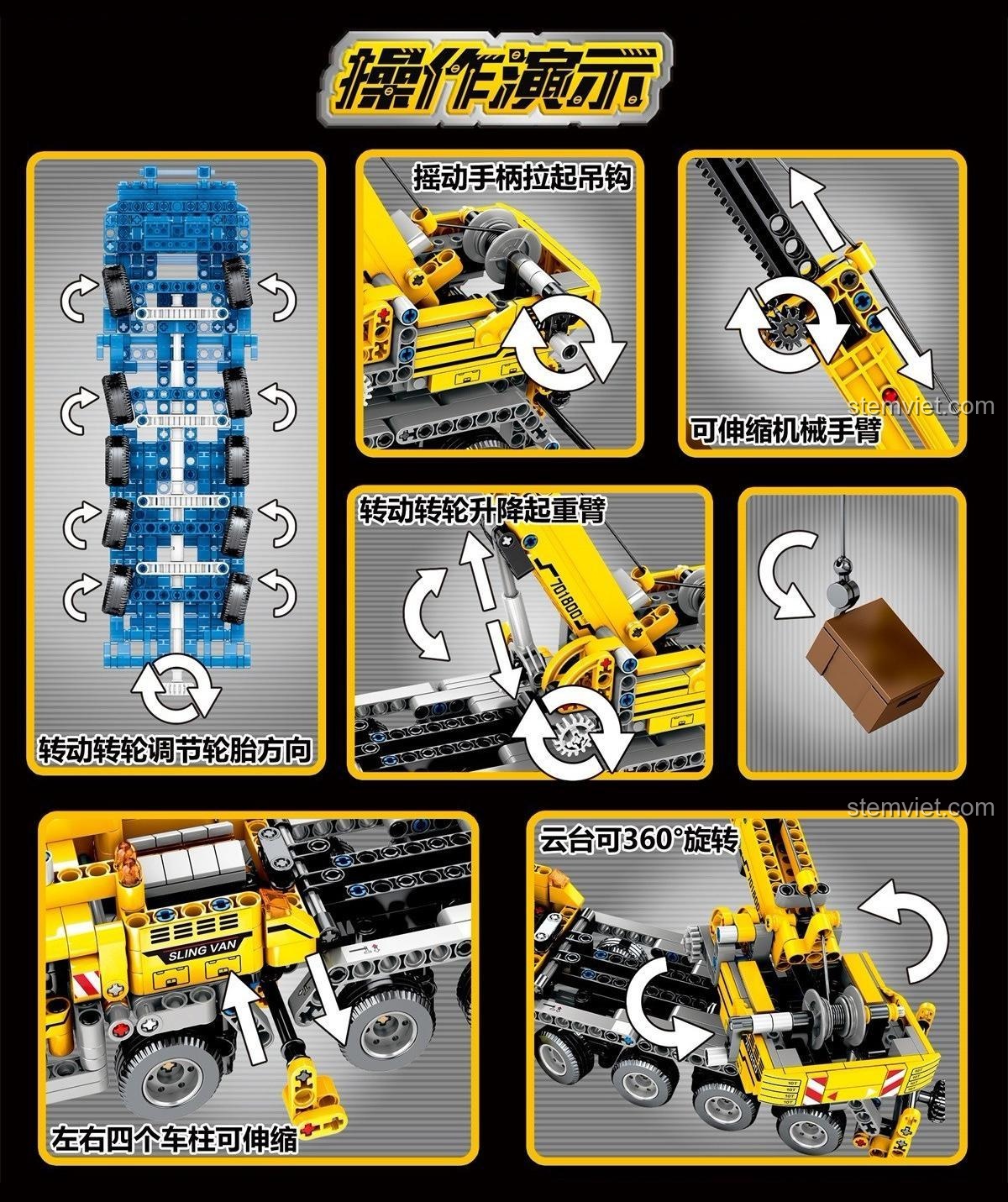 - Cần cẩu linh hoạt: Sử dụng các bánh răng bên hông, bé có thể nâng hạ cần cẩu lên xuống, và vươn dài hoặc thu ngắn cánh tay cẩu một cách mượt mà.