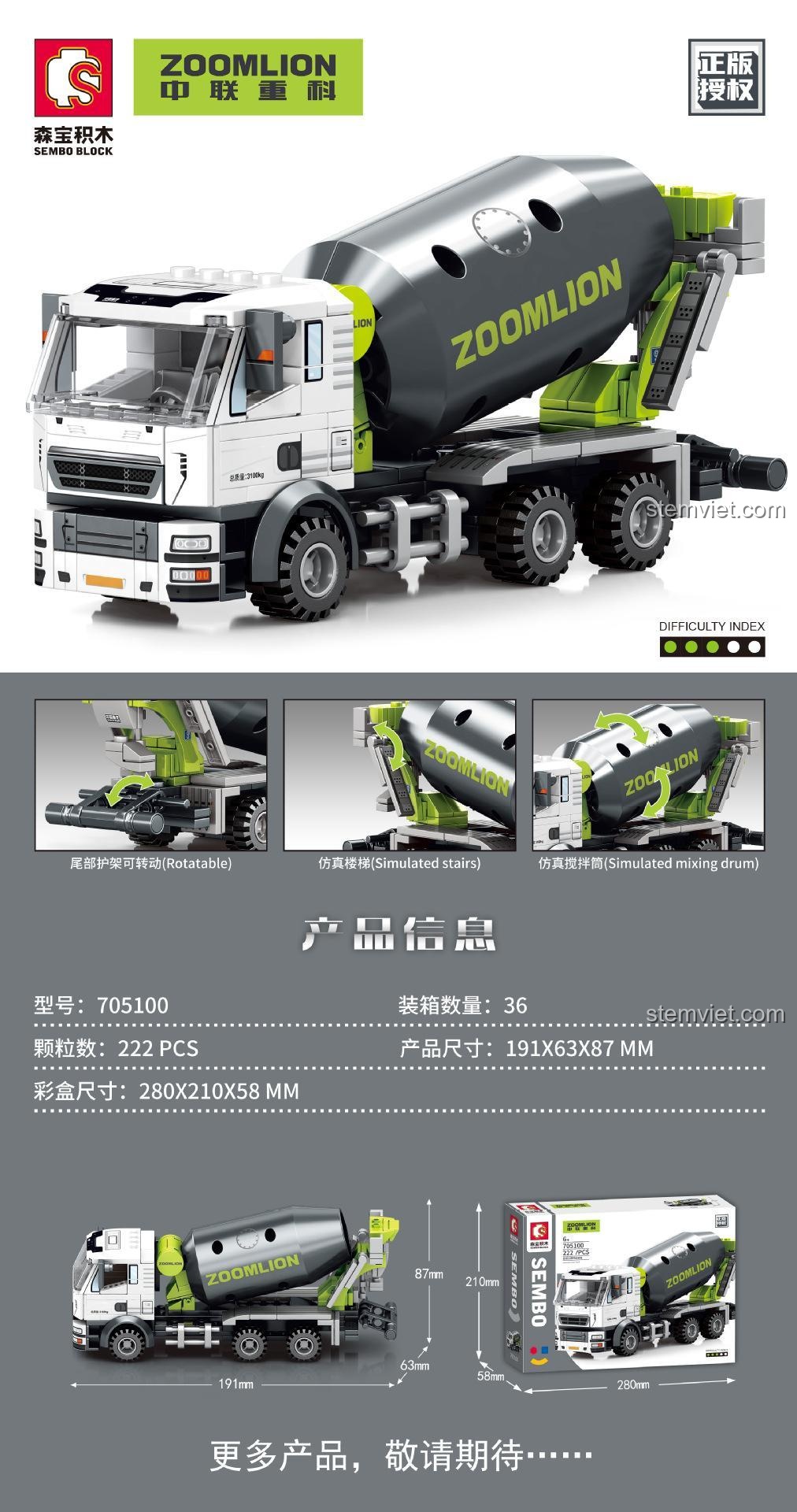 SEMBO 705100: Bộ lắp ráp Xe Trộn Bê Tông Zoomlion (222 mảnh ghép) – Sức Mạnh Bê Tông