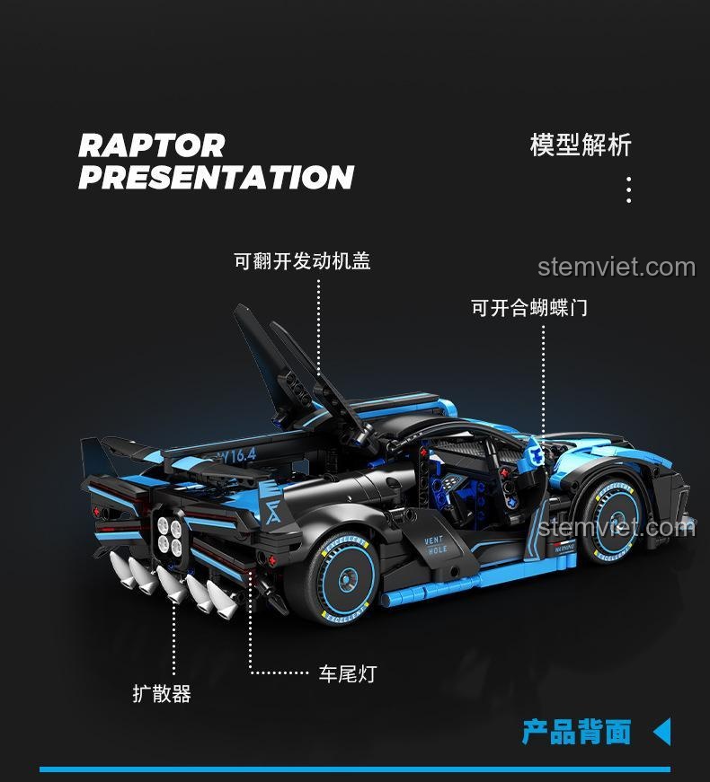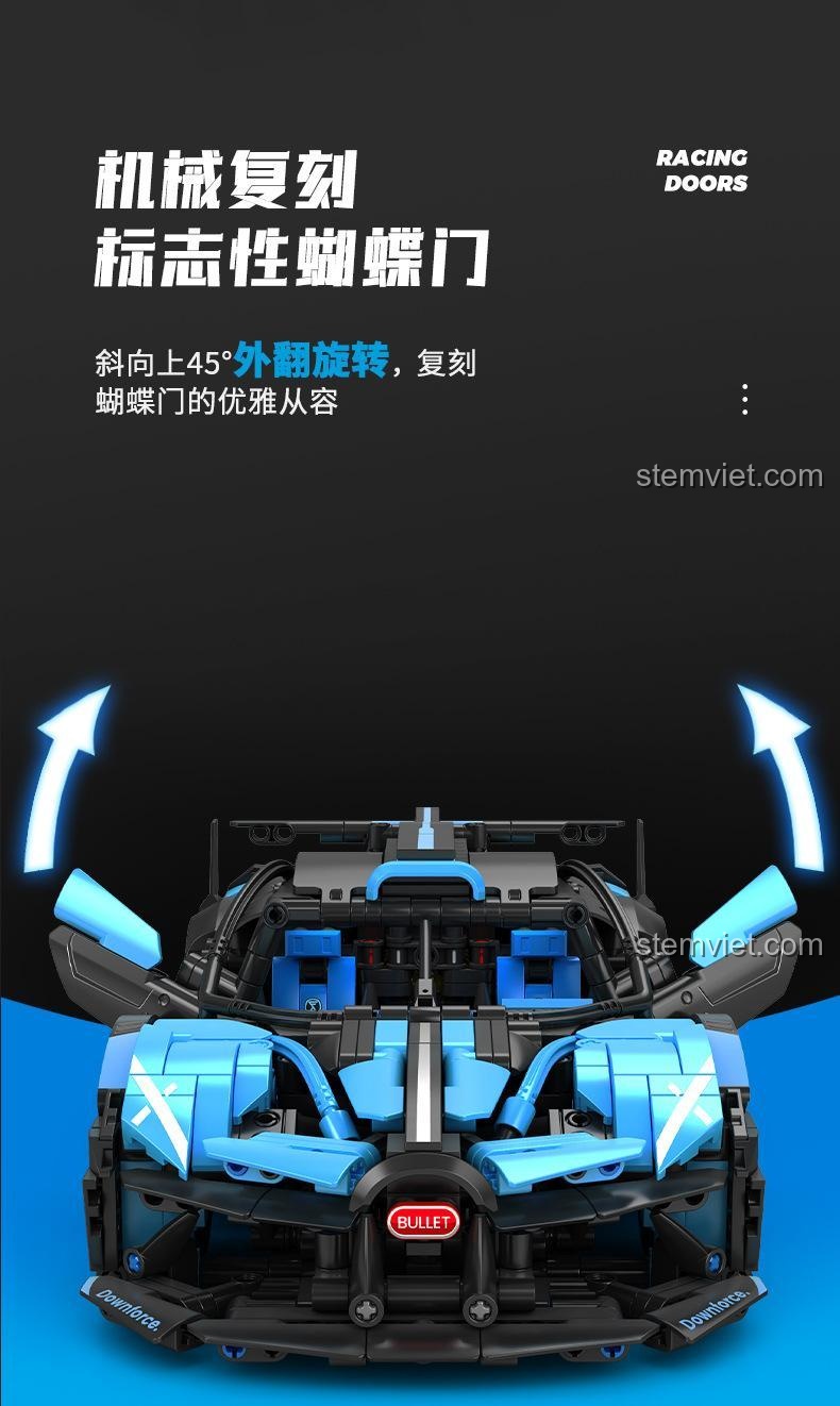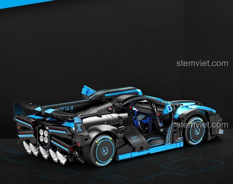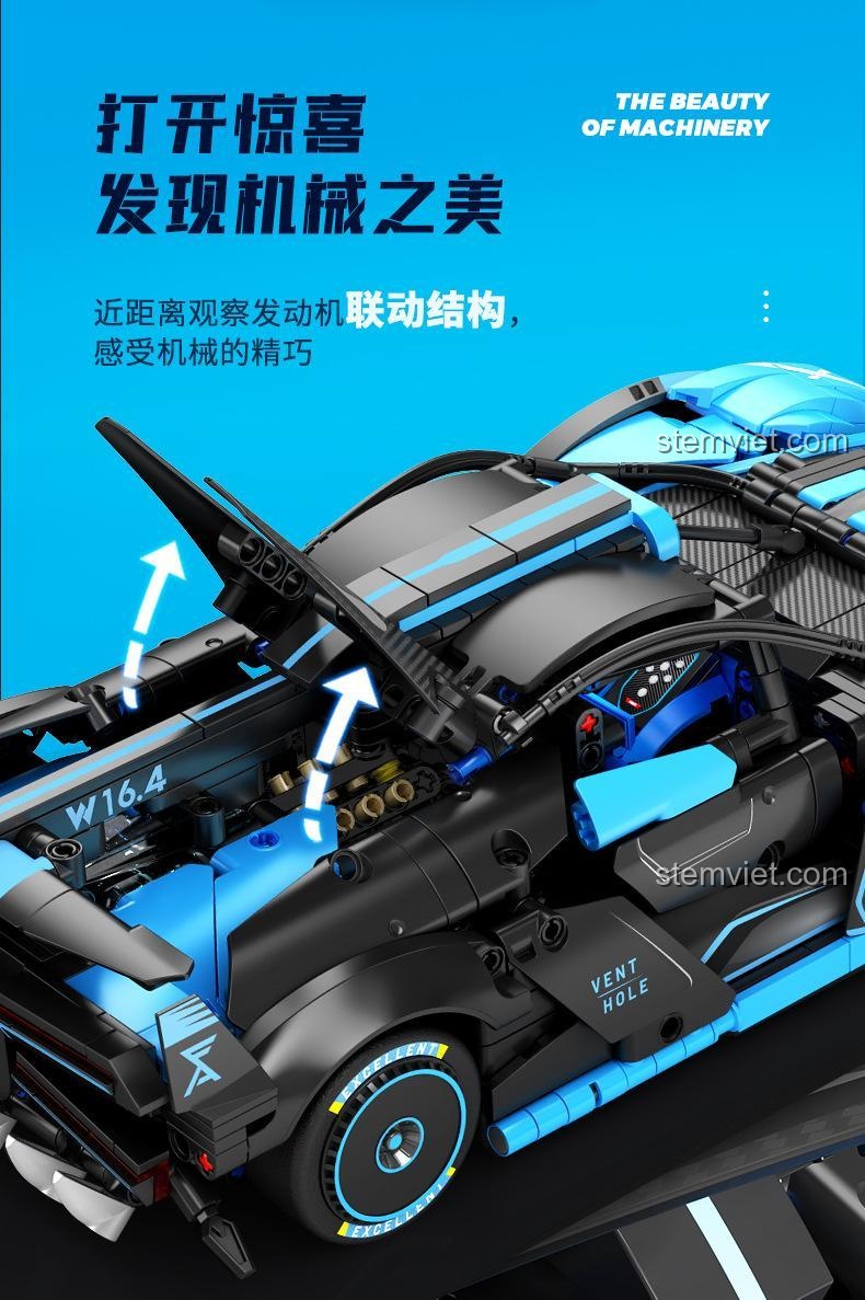 Điểm nhấn không thể bỏ qua chính là cặp cửa cánh bướm (butterfly doors) có thể mở lên một góc 45 độ, phô diễn nội thất tinh xảo bên trong. Bé có thể dễ dàng quan sát buồng lái được thiết kế chi tiết với vô lăng có thể liên kết với bánh xe, ghế ngồi thể thao và bảng điều khiển mô phỏng. Nắp capo phía sau cũng có thể mở ra để lộ động cơ mô phỏng W16.4 mạnh mẽ, mang đến cái nhìn chân thực về cấu trúc cơ khí phức tạp của một siêu xe. Mỗi mảnh ghép đều được chăm chút để đảm bảo độ chính xác cao, giúp chiếc xe không chỉ đẹp mắt mà còn vững chắc sau khi hoàn thành.