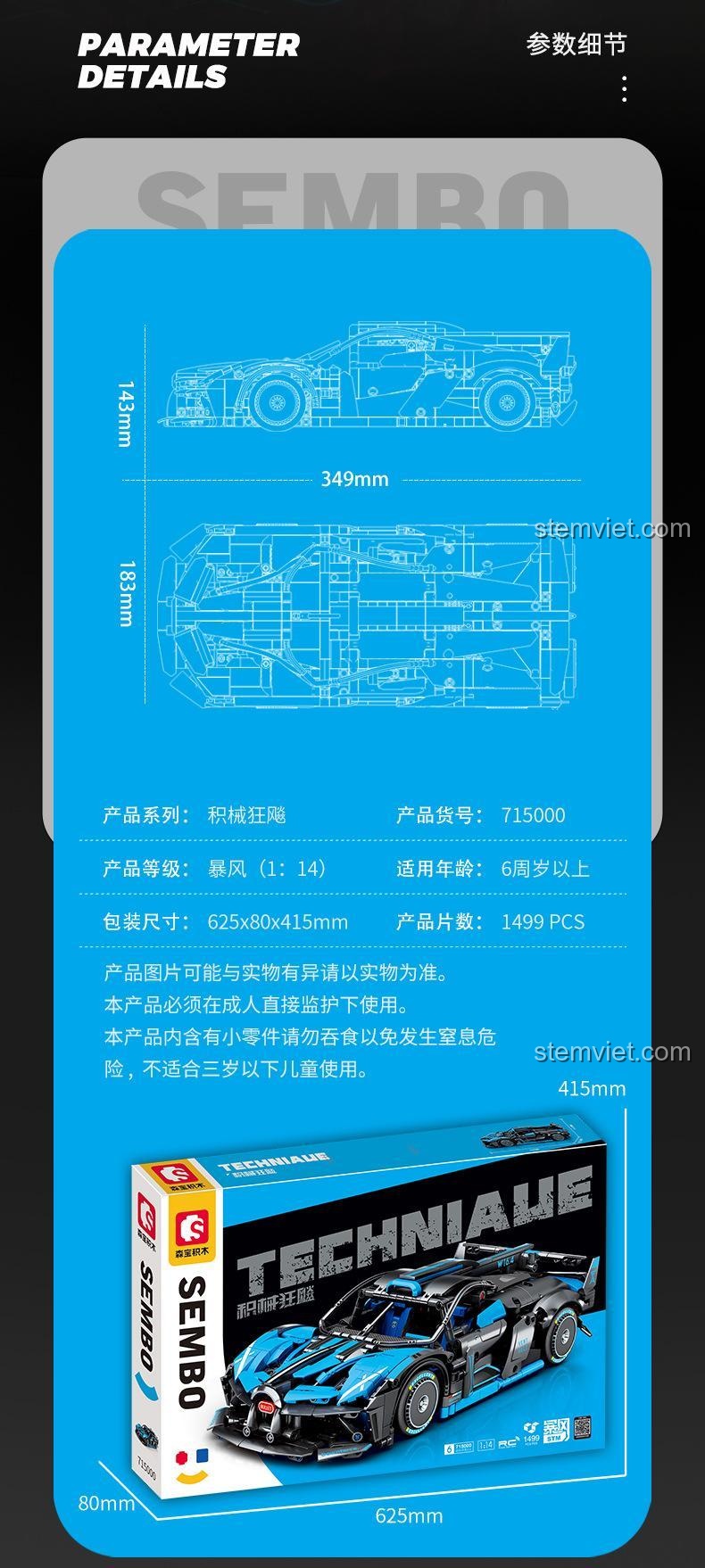 Bộ lắp ráp SEMBO 715000 Siêu xe Bugatti Bolide có 1499 chi tiết và được khuyến nghị cho bé từ 6 tuổi trở lên. Mặc dù số lượng chi tiết khá lớn, nhưng bộ sản phẩm đi kèm hướng dẫn lắp ráp chi tiết, rõ ràng, giúp bé dễ dàng theo dõi và hoàn thành. Đây là một thử thách vừa sức, giúp bé rèn luyện sự kiên nhẫn và khả năng giải quyết vấn đề.