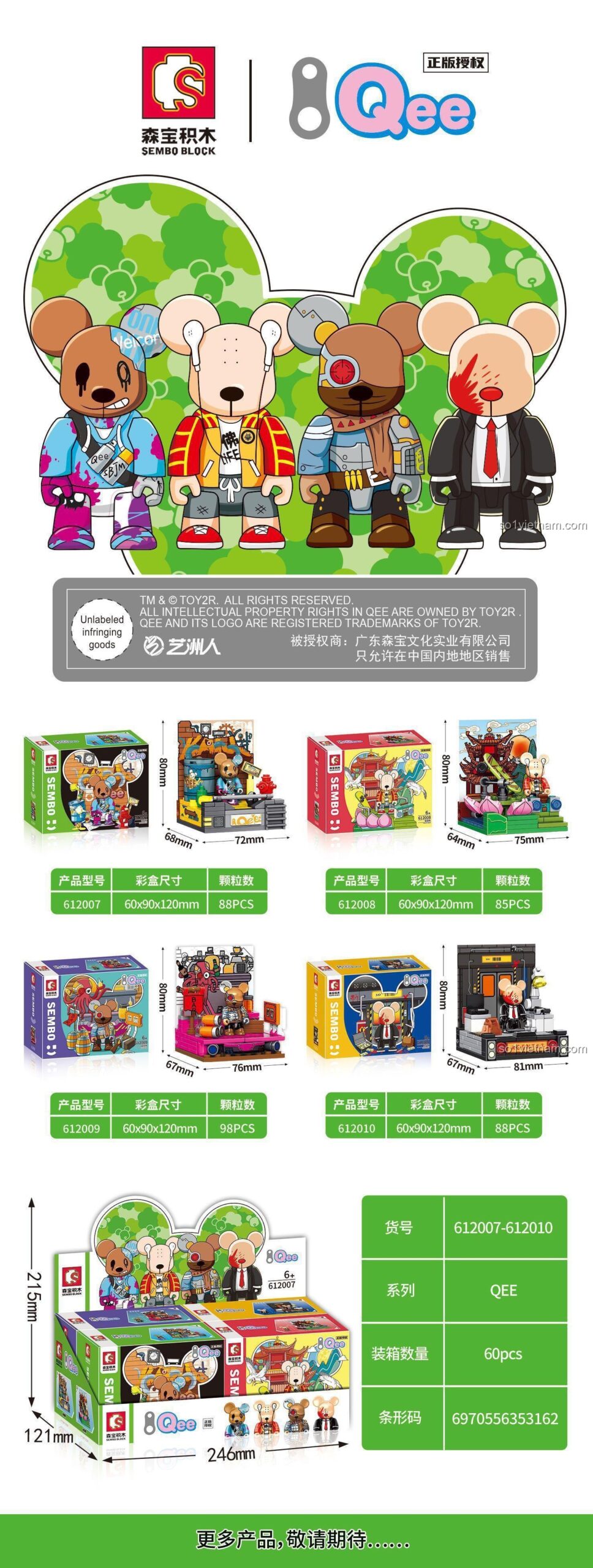 • Kết hợp bộ SEMBO BLOCK 612010 Agent 47 với các bộ “Qee Bear” khác như 612007 (Doodle Bear), 612008 (Travel Bear), 612009 (Punk Bear) để tạo nên một bộ sưu tập “Qee Bear” đa dạng và đầy màu sắc.