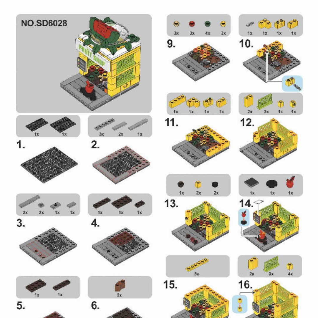Bạn đang tìm kiếm hướng dẫn lắp ráp Sembo SD 6028 Tiệm hoa quả? Bạn bị thiếu hướng dẫn Cửa hàng trái cây mini SD6028 hoặc mất hướng dẫn lắp ghép Sembo SD 6028 Sạp trái cây mini? Đừng lo lắng! Kho đồ chơi trẻ em cung cấp giải pháp hoàn hảo: file PDF hướng dẫn lắp ráp gốc chất lượng cao cho bộ đồ chơi lắp ráp Cửa hàng trái cây mini của hãng Sembo.