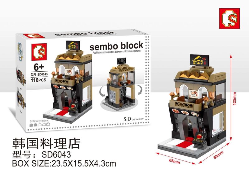Ngay từ cái nhìn đầu tiên, đồ chơi mô hình Sembo này đã chinh phục người xem bởi thiết kế nhỏ gọn nhưng vô cùng chi tiết và sống động. Với tông màu chủ đạo là nâu, đen và xám, mô hình toát lên vẻ ấm cúng, hiện đại của một quán ăn Hàn Quốc thực thụ. Từng chi tiết nhỏ như tấm biển hiệu với chữ Hàn, những món ăn trưng bày, lan can ban công, hay thậm chí là tấm thảm đỏ mời gọi trước cửa đều được tái hiện một cách tỉ mỉ. Kích thước sau khi lắp ráp là 12.5cm (cao) x 8.0cm (dài) x 6.5cm (rộng), một kích thước hoàn hảo để trưng bày trên bàn học hoặc kệ sách mà không chiếm quá nhiều diện tích. Đặc biệt, các cửa sổ lớn bằng nhựa trong suốt cho phép bé nhìn ngắm không gian nội thất được bài trí bên trong, kích thích trí tò mò và tạo cảm giác chân thực như đang ghé thăm một quán ăn thật sự.