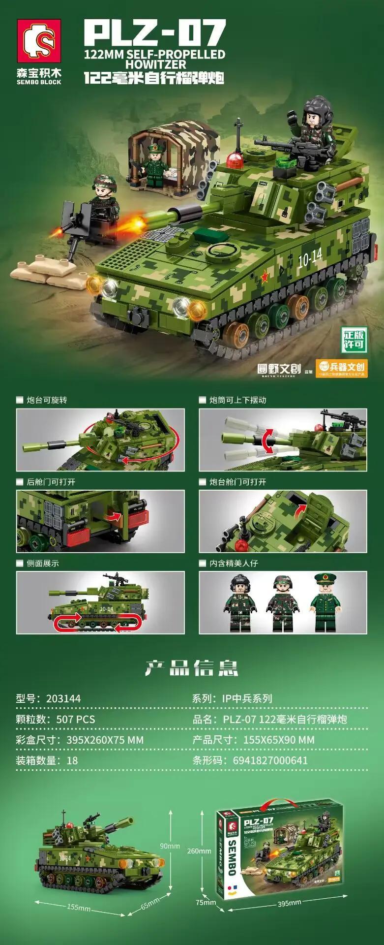 Bộ đồ chơi SEMBO 203144 PLZ-07 122MM Self-Propelled Howitzer có thiết kế mô phỏng chi tiết, tháp pháo xoay linh hoạt, nòng pháo nâng hạ, cửa khoang đạn mở và đi kèm 3 minifigures sống động.