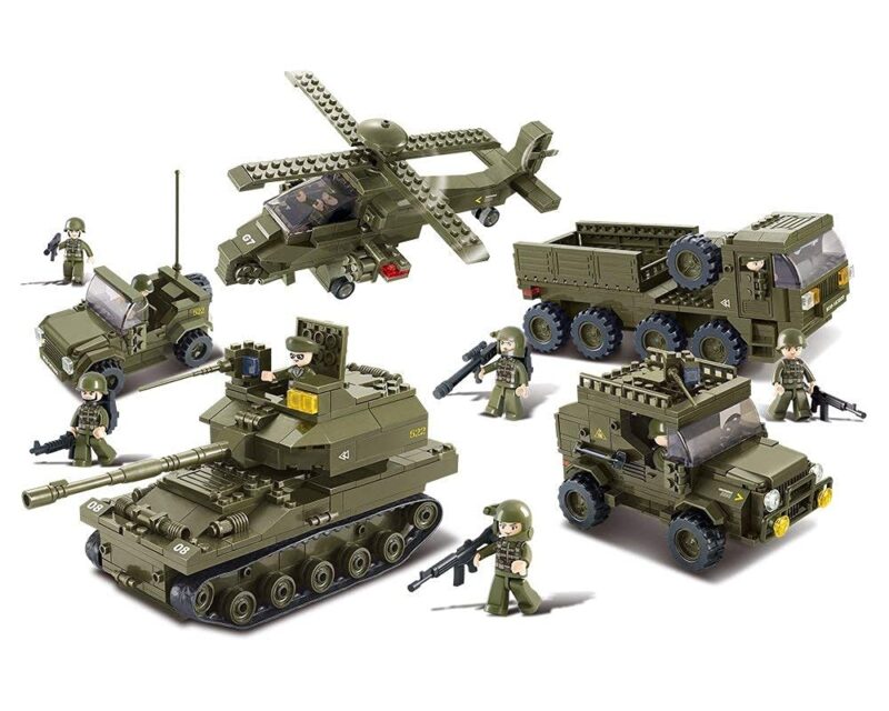 Bộ sản phẩm bao gồm 4 phương tiện quân sự chính: một xe tăng chiến đấu, một máy bay trực thăng tấn công, một xe tải quân sự vận chuyển và một xe Jeep dã chiến. Mỗi phương tiện đều có thiết kế độc đáo và chi tiết, mang lại trải nghiệm chơi đa dạng cho bé.