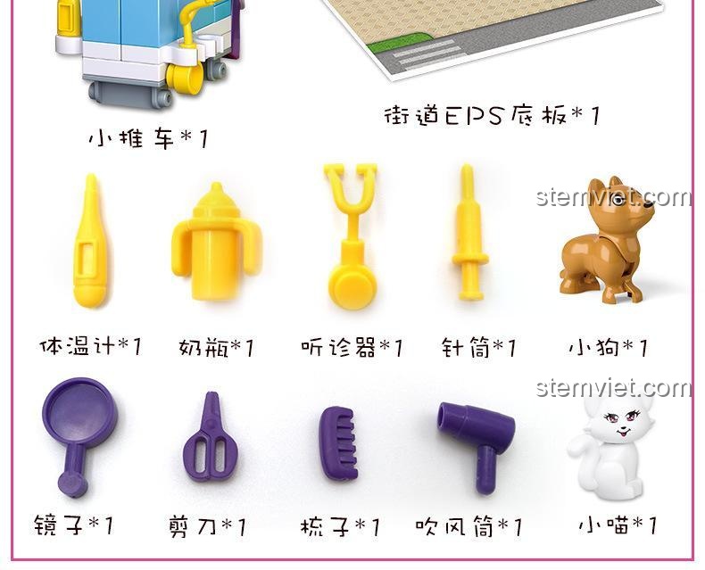 - Phụ kiện đa dạng: Đi kèm là các phụ kiện mô phỏng chân thực các dụng cụ chăm sóc thú cưng như nhiệt kế, ống nghe, lược chải lông, máy sấy tóc, bình sữa, và cả một chiếc cân để đo trọng lượng cho thú cưng.
