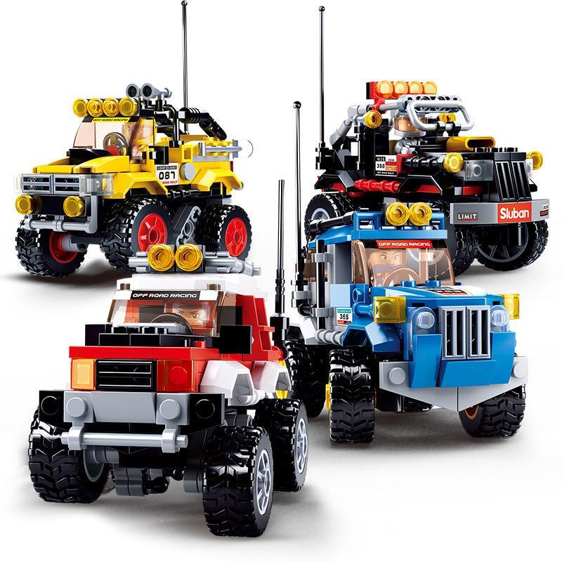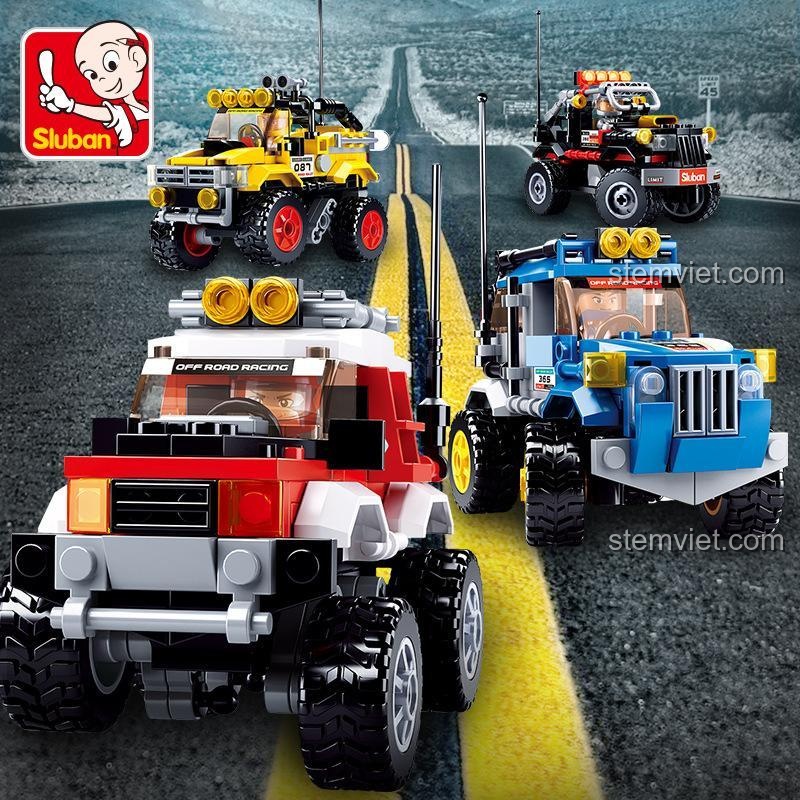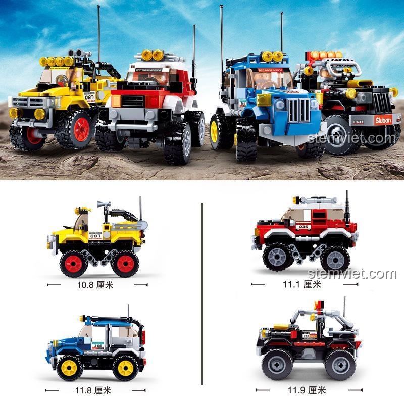 Bộ sản phẩm này cho phép bé lắp ráp 4 mẫu xe địa hình khác nhau, mỗi mẫu có thiết kế và màu sắc riêng biệt, mang đến sự đa dạng và hứng thú không giới hạn cho bé.
