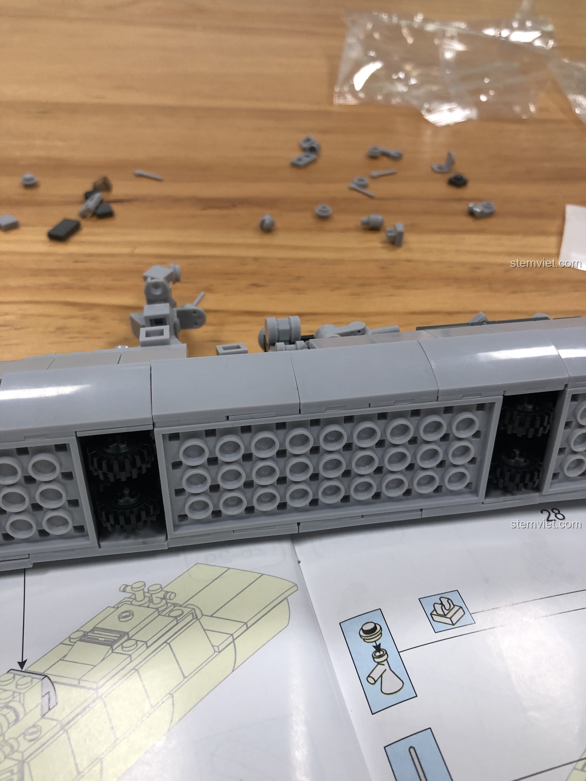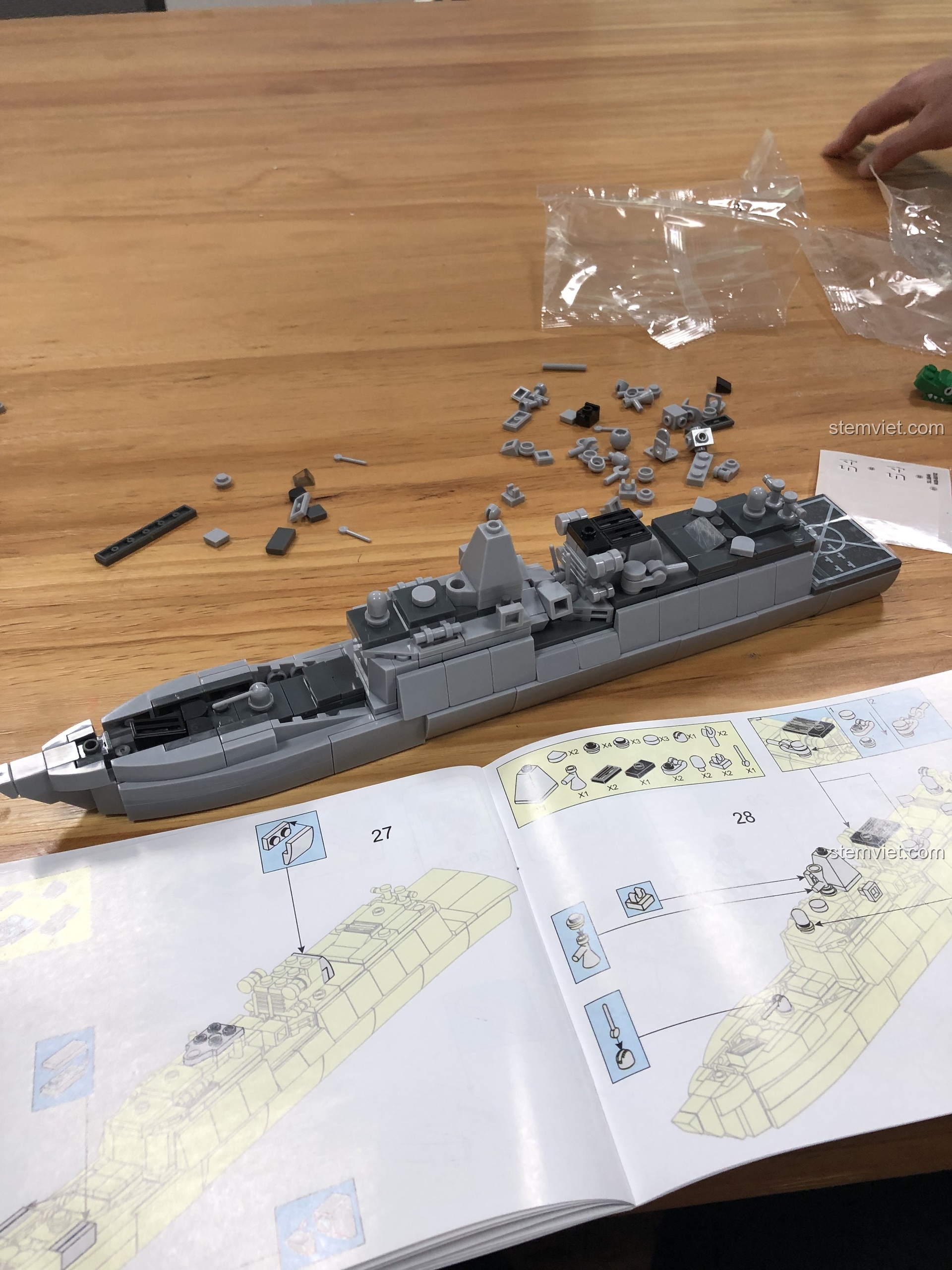 Sau khi hoàn thành, mô hình tàu hộ vệ sẽ có chiều dài khoảng 33.2 cm, rộng 7.5 cm và cao 7.8 cm. Đây là kích thước lý tưởng để bé chơi hoặc trưng bày trên bàn học, kệ sách.