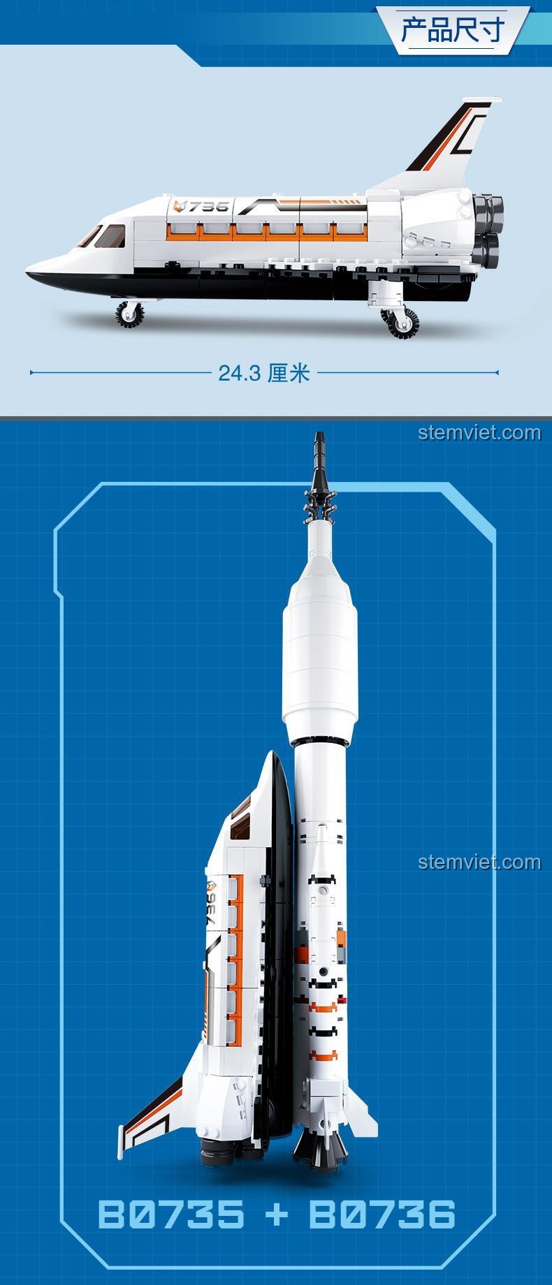 Sau khi lắp ráp hoàn chỉnh, mô hình Tàu Con Thoi sẽ có chiều dài ấn tượng là 24.3 cm, một kích thước lý tưởng để bé cầm nắm, vui chơi hoặc trưng bày trong góc học tập của mình.