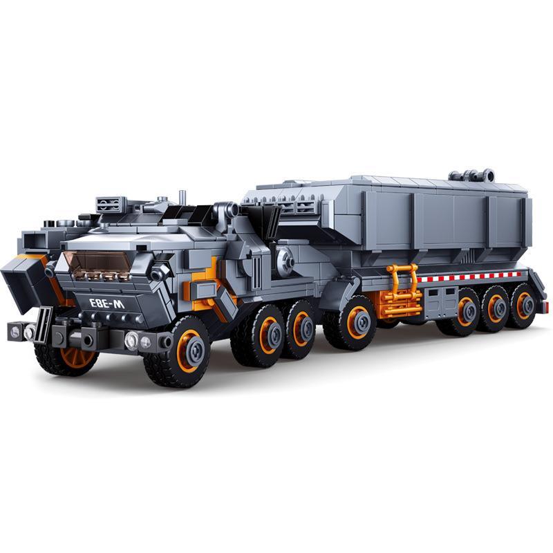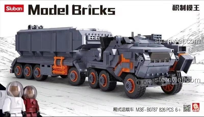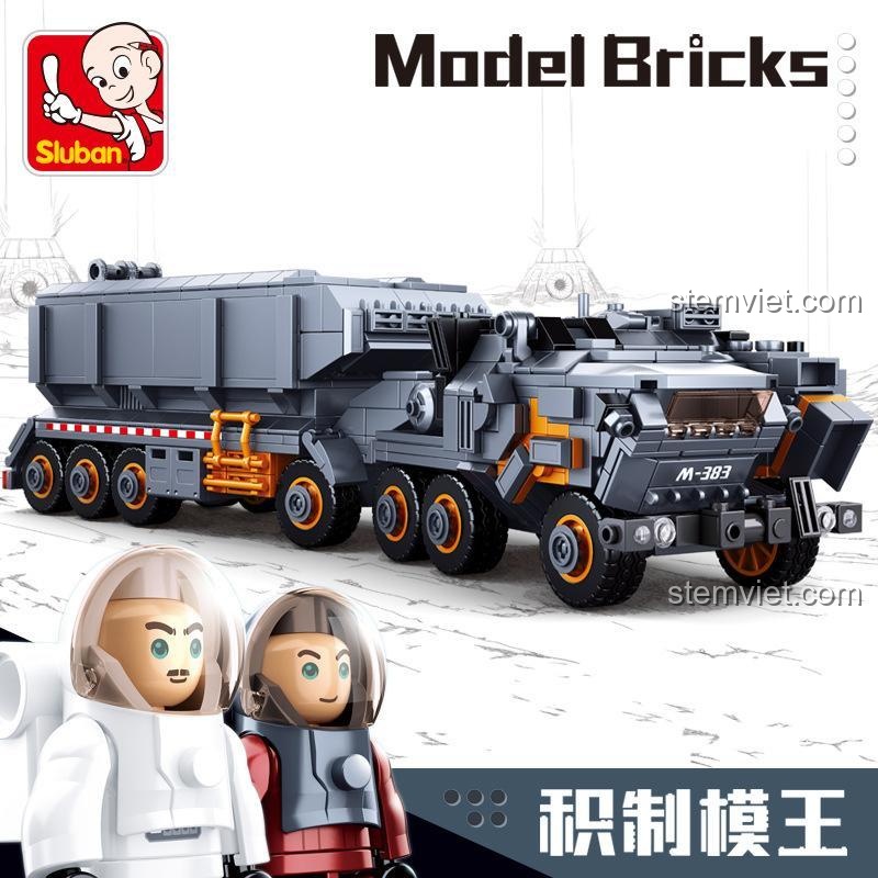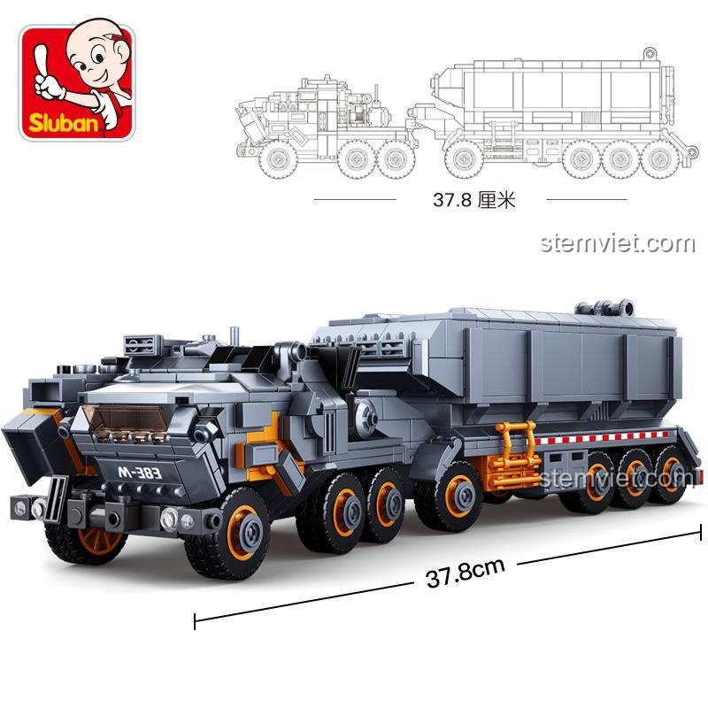 Ngay từ cái nhìn đầu tiên, mô hình Xe Tải Vận Chuyển Lưu Động Địa Cầu đã gây ấn tượng mạnh mẽ với thiết kế hầm hố, đậm chất tương lai. Với chiều dài lên tới 37.8 cm sau khi hoàn thành, đây là một mô hình có kích thước đáng nể, đủ sức làm trung tâm của mọi bộ sưu tập. Tông màu chủ đạo là xám và đen, điểm xuyết các chi tiết màu cam nổi bật, tạo nên một vẻ ngoài vừa mạnh mẽ, vừa hiện đại. Các nhà thiết kế của Sluban đã tái hiện một cách tỉ mỉ từng chi tiết của chiếc xe trong phim, từ phần đầu kéo bọc thép với 10 bánh xe cho đến phần rơ-moóc chở hàng phía sau với 12 bánh xe, tổng cộng 22 bánh xe hùng vĩ. Phần đầu kéo và rơ-moóc có thể kết nối và tách rời linh hoạt, cho phép bé sáng tạo nhiều kịch bản vận chuyển khác nhau. Mỗi góc cạnh, từ cabin lái, các đường ống, cho đến thùng chứa hàng, đều được chăm chút kỹ lưỡng, mang lại một trải nghiệm lắp ráp và trưng bày vô cùng thỏa mãn.