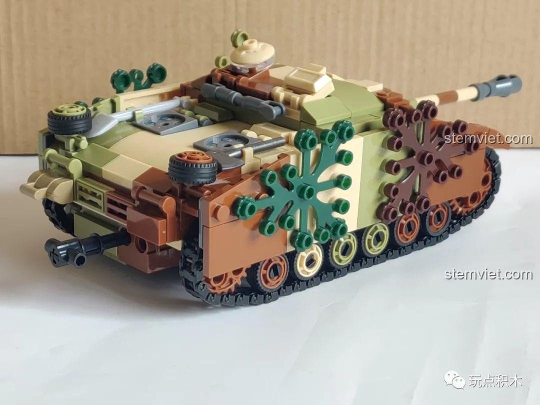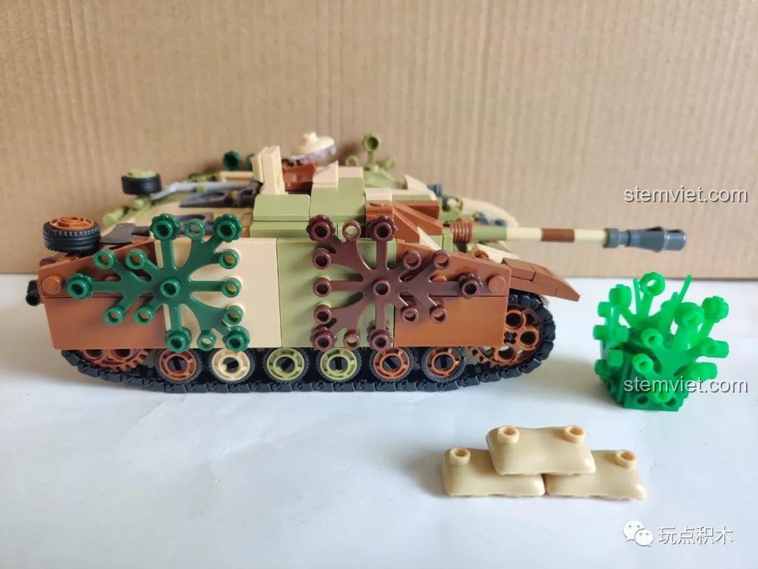 Điểm khiến các bé trai và cả những ông bố đam mê mô hình quân sự phải ‘wow’ chính là độ chi tiết và chân thực của bộ xếp hình M38-B0858. Mô hình tái hiện gần như hoàn hảo chiếc pháo tự hành StuG III ngoài đời thật với chiều dài ấn tượng 22.6 cm. Điểm đặc biệt nhất chính là lớp ngụy trang rằn ri đặc trưng của quân đội Đức. Thay vì dùng decal dán dễ bong tróc, Sluban đã khéo léo sử dụng các mảnh ghép với nhiều tông màu khác nhau (Nâu, Xanh lá, Kem) để tạo nên một lớp ‘áo giáp’ vừa bền đẹp, vừa kích thích thị giác. Từng chi tiết nhỏ như bánh xích, bánh xe chịu lực, các dụng cụ công binh (rìu, xẻng) gắn trên thân xe, cho đến các tấm giáp phụ và những cành lá ngụy trang đều được chăm chút tỉ mỉ. Thậm chí, 3 minifigures lính Đức đi kèm cũng có quân phục và biểu cảm riêng, sẵn sàng cho mọi kịch bản chiến đấu mà bé tưởng tượng ra. Tất cả tạo nên một tổng thể hài hòa, một mô hình quân sự chất lượng cao, xứng đáng có mặt trong bộ sưu tập của bất kỳ ‘chỉ huy’ nhí nào.