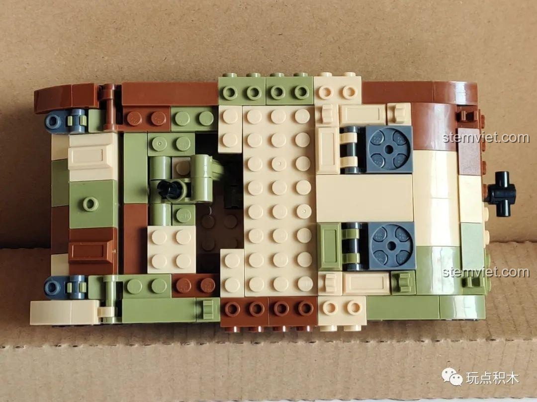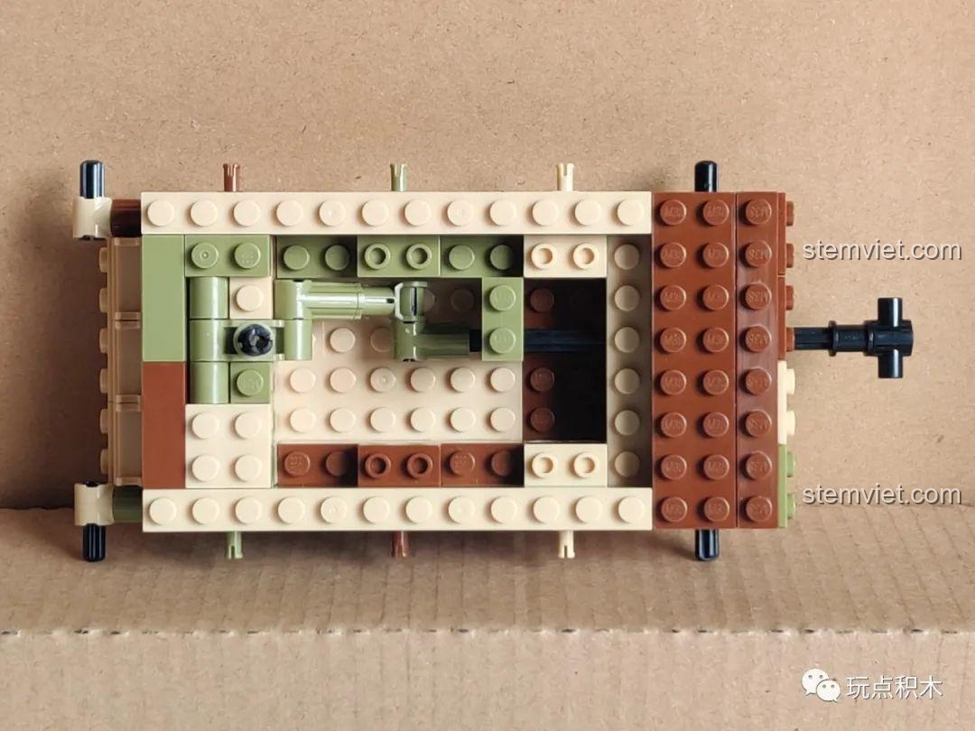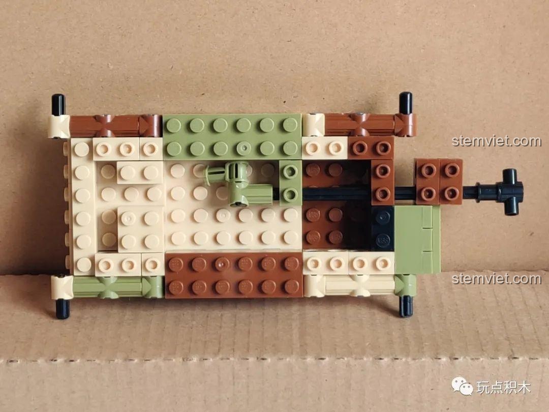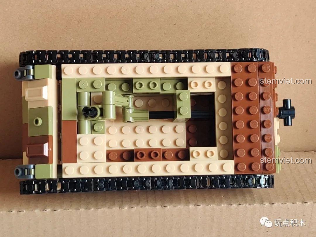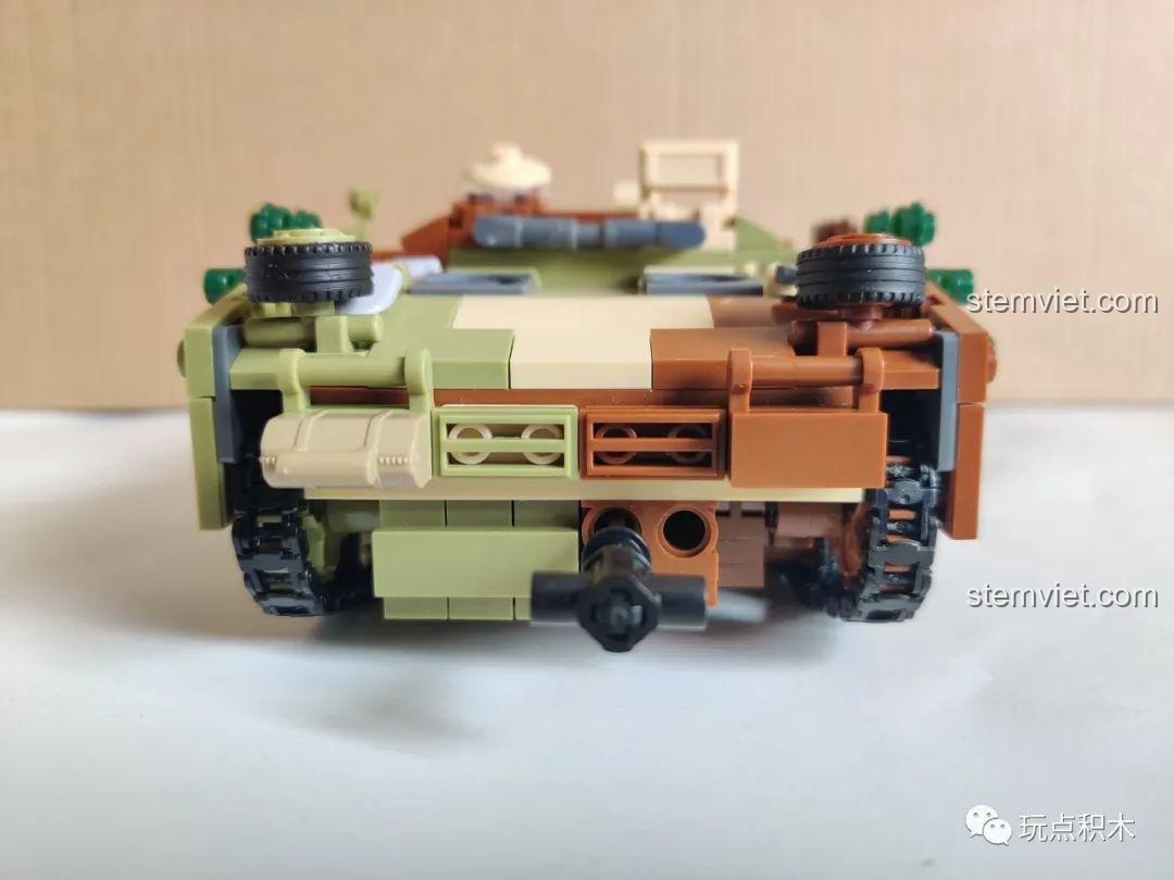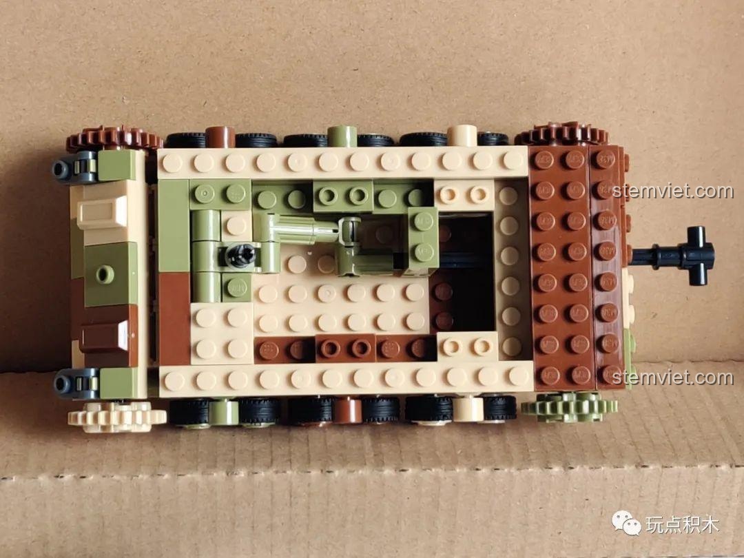 Một mô hình tĩnh đã thú vị, nhưng một mô hình có thể ‘cử động’ còn tuyệt vời hơn! Bộ lắp ghép Xe tăng StuG III M38B0858 không chỉ để trưng bày mà còn mang lại trải nghiệm chơi tương tác đầy hấp dẫn. Hệ thống xích xe được tạo thành từ nhiều mắt xích nhỏ riêng lẻ, sau khi lắp ráp có thể chuyển động mượt mà trên nhiều bề mặt, từ sàn nhà đến thảm, cho phép bé đẩy xe đi ‘tuần tra’ khắp phòng. Điểm nhấn kỹ thuật đáng chú ý nhất là cơ cấu liên kết thông minh, cho phép bé xoay một bánh răng nhỏ phía sau để điều khiển nòng pháo chính nâng lên hạ xuống, mô phỏng hành động ngắm bắn mục tiêu. Ngoài ra, các cửa hầm trên nóc xe có thể đóng mở, cho phép đặt minifigure vào vị trí chỉ huy hoặc pháo thủ. Những tính năng này không chỉ tăng thêm phần sống động cho mô hình mà còn giúp bé hiểu được các nguyên lý cơ bản về cơ khí và chuyển động, biến giờ chơi thành một buổi học thực hành đầy lý thú.