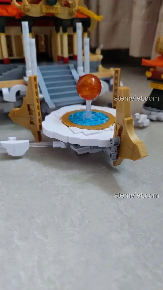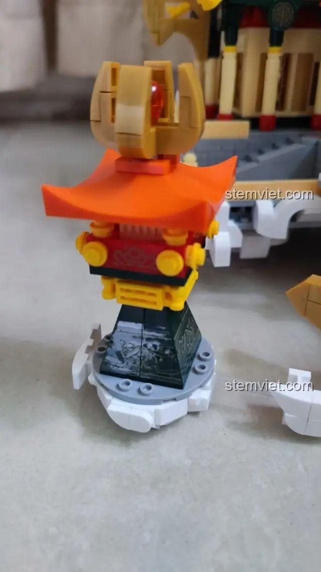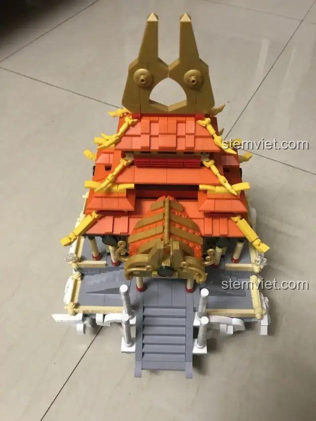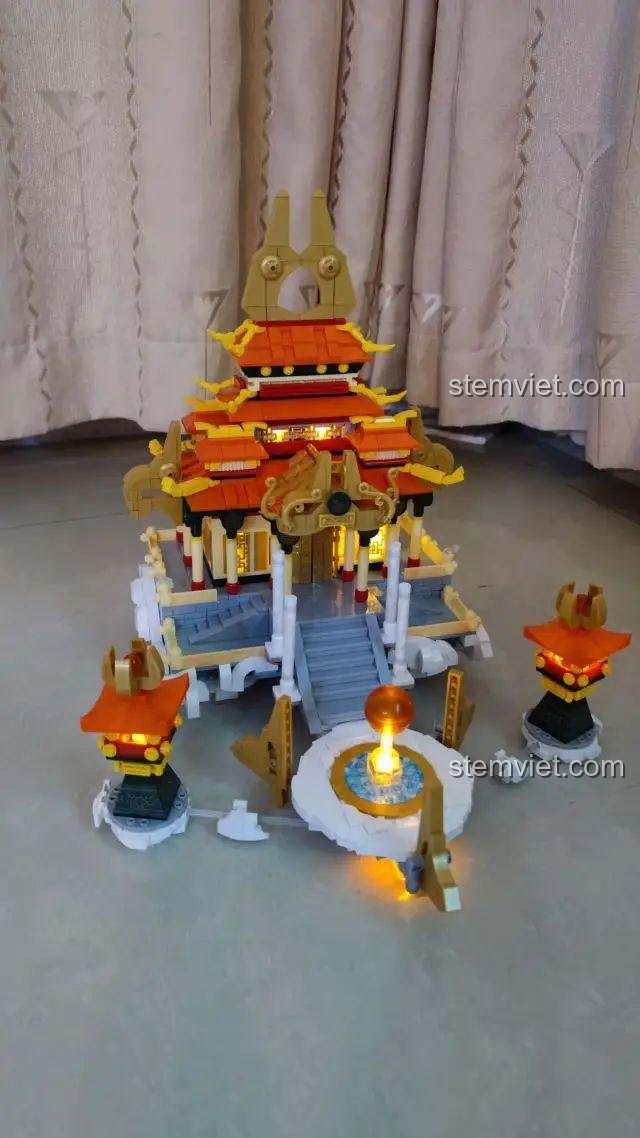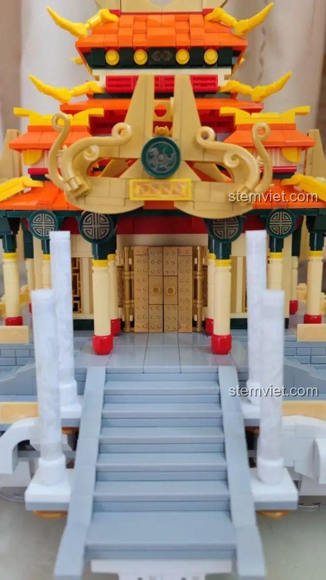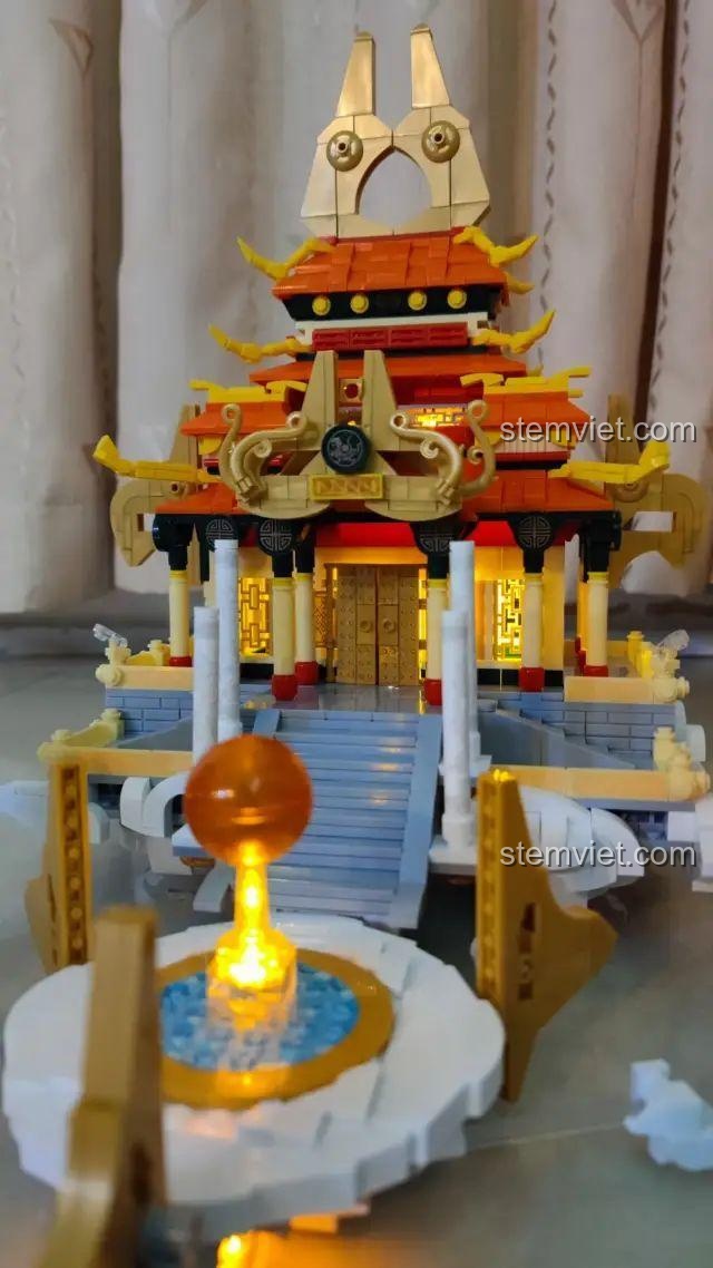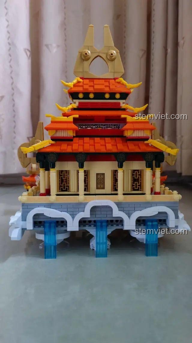 Mô hình có chiều dài 33.2 cm, chiều rộng 39.5 cm và chiều cao 34.5 cm, kích thước lý tưởng để trưng bày trên bàn học, kệ sách hoặc trong phòng khách. Đặc biệt, các chi tiết trang trí như mây và thác nước được thiết kế độc đáo, tạo nên một khung cảnh thần tiên, huyền ảo bao quanh cung điện. Ngay cả những tấm dán UV cảm ứng áp suất cũng được sử dụng để tăng thêm độ chân thực và vẻ đẹp lộng lẫy cho mô hình, biến bộ đồ chơi xây dựng này thành một kiệt tác kiến trúc Á Đông thu nhỏ.