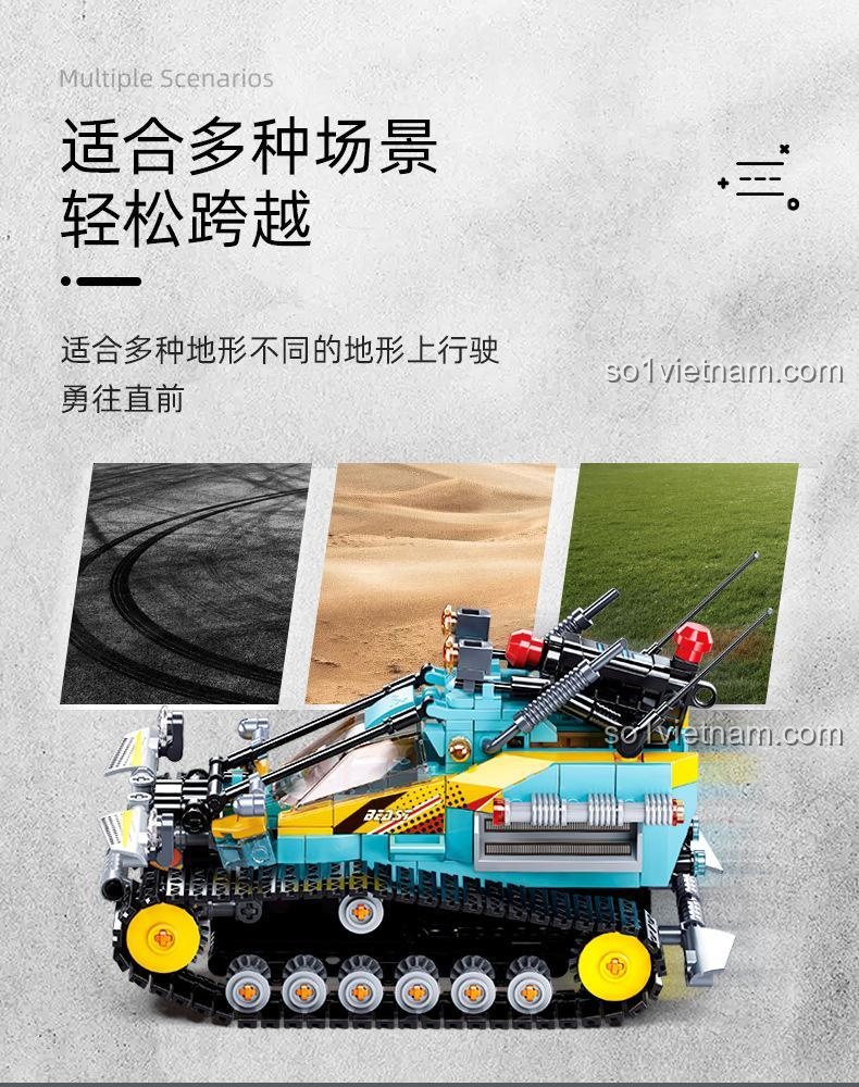 Nhờ hệ thống bánh xích mạnh mẽ, chiếc **Xe Điều Khiển Từ Xa Thiên Yết B1021** này có khả năng di chuyển linh hoạt trên nhiều loại địa hình khác nhau như sàn nhà, thảm, đường đất nhẹ, hoặc thậm chí là các chướng ngại vật nhỏ, mang lại trải nghiệm chơi đa dạng và thú vị.