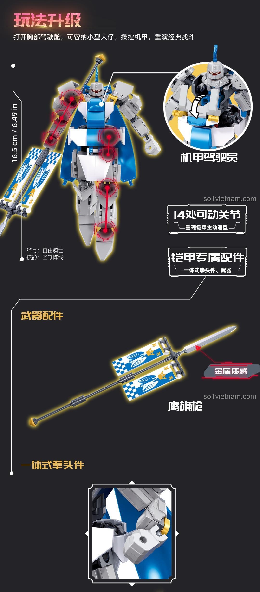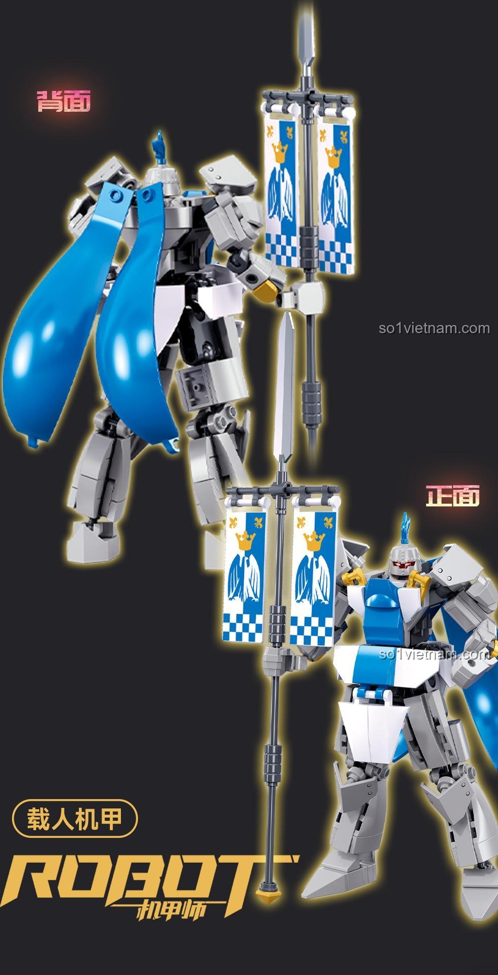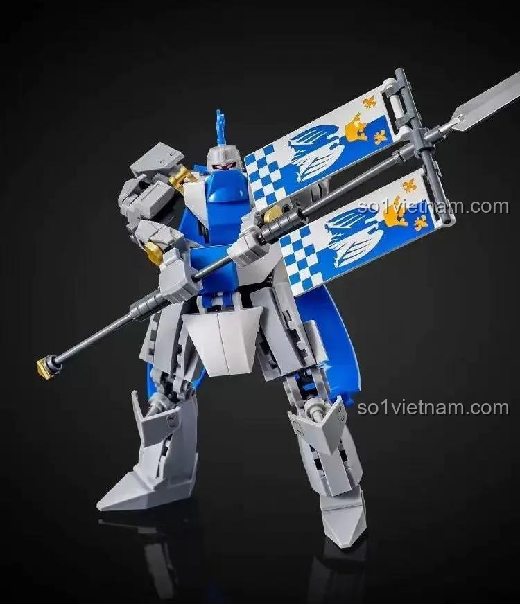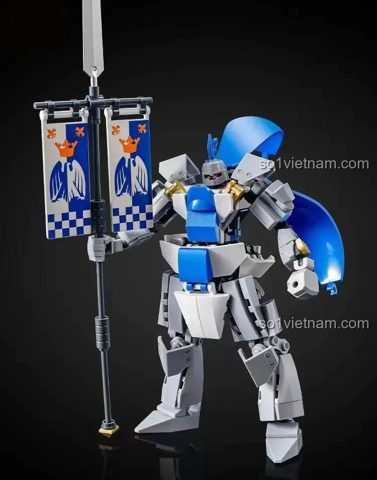 Ngay từ cái nhìn đầu tiên, đồ chơi mô hình Mecha Hộ Vệ Sluban M38-B1310 đã toát lên vẻ oai phong, lẫm liệt. Với chiều cao ấn tượng 16.5cm sau khi hoàn thành, mô hình là sự kết hợp hoàn hảo giữa các gam màu Xanh dương, Xám và Trắng, tạo nên một tổng thể vừa hiện đại, vừa mang đậm chất hiệp sĩ. Từng chi tiết trên bộ giáp, từ tấm che ngực, giáp vai cho đến phần chân vững chãi, đều được thiết kế tỉ mỉ, sắc nét. Điểm nhấn đặc biệt chính là cây thương dài gắn hai lá cờ hiệu, biểu tượng của lòng dũng cảm và danh dự. Bộ giáp không chỉ đẹp mắt mà còn thể hiện sức mạnh và sự kiên cố, sẵn sàng đối mặt với mọi kẻ thù. Đây không chỉ là một món đồ chơi, mà còn là một tác phẩm nghệ thuật, một mô hình trưng bày tuyệt đẹp trong góc học tập của bé, khơi gợi niềm tự hào và cảm hứng mỗi ngày.