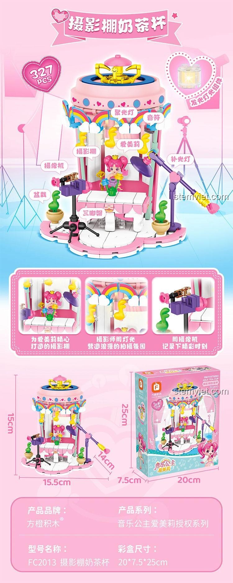 Bộ lắp ráp Công chúa Emily Forange FC2013 gây ấn tượng mạnh mẽ với thiết kế tỉ mỉ và màu sắc chủ đạo là hồng, trắng, vàng, xanh dương, tạo nên một tổng thể hài hòa và bắt mắt. Với kích thước mô hình dài 15.5 cm, rộng 14 cm và cao 15 cm, mô hình Studio chụp ảnh FC2013 này vừa vặn để bé trưng bày trên bàn học hay kệ sách, trở thành một điểm nhấn đáng yêu trong phòng. Từng chi tiết nhỏ như máy ảnh, đèn chiếu sáng, microphone và cây cảnh mini đều được tái hiện một cách chân thực, giúp bé dễ dàng nhập vai và sáng tạo các kịch bản chơi.