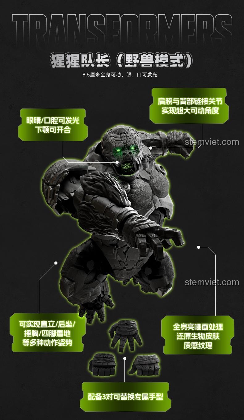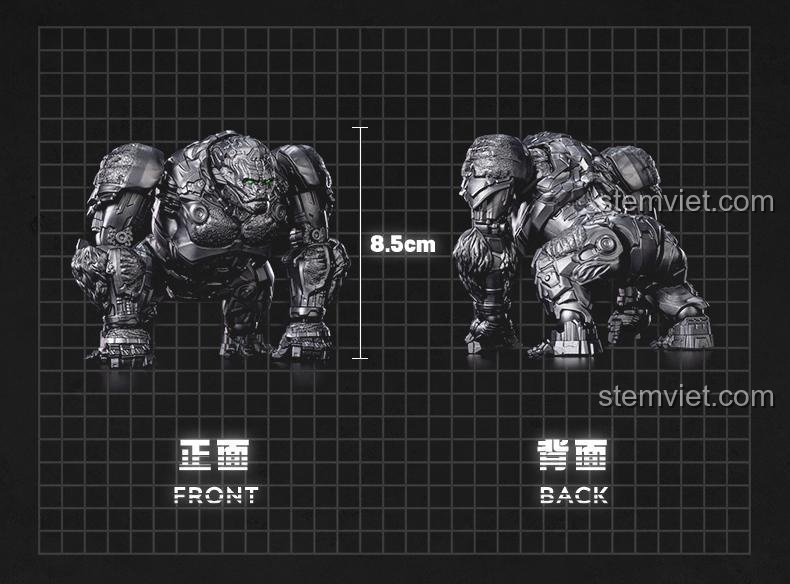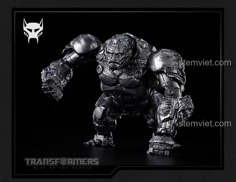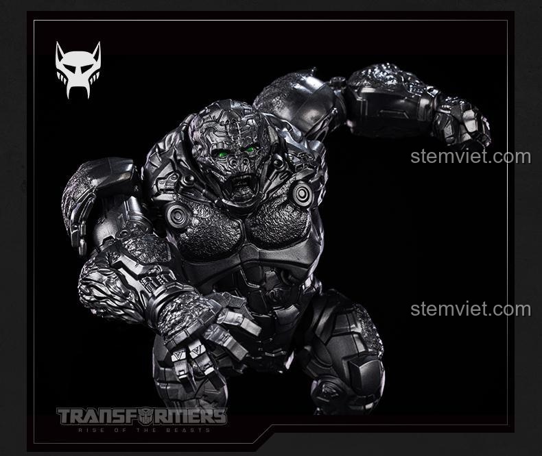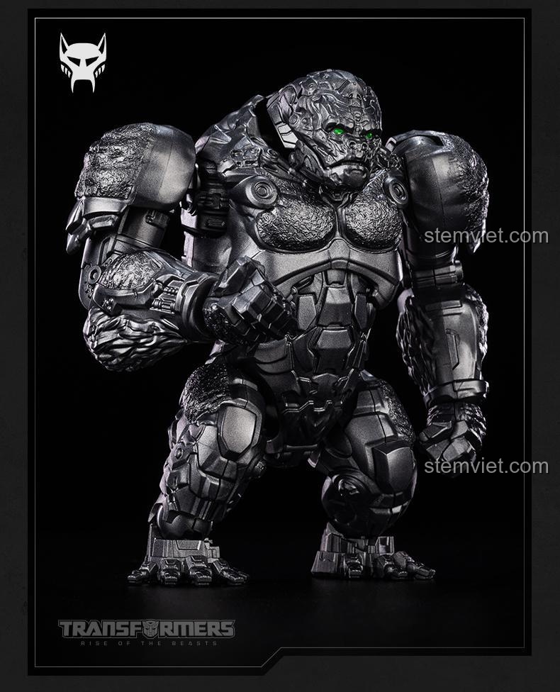 Mô hình Optimus Primal Beast Mode BLOKEES 71144 là một kiệt tác về thiết kế, tái hiện chân thực hình ảnh thủ lĩnh Maximal trong dạng gorilla. Với chiều cao 8.5cm, mô hình này sở hữu một vẻ ngoài mạnh mẽ, cơ bắp cuồn cuộn, sẵn sàng cho mọi cuộc chiến. Màu sắc chủ đạo là đen và xám, kết hợp với đôi mắt xanh lá phát sáng đầy uy lực, tạo nên một tổng thể ấn tượng và đầy sức sống. Từng chi tiết trên bề mặt mô hình được xử lý tỉ mỉ, mô phỏng kết cấu da sinh học của gorilla, mang lại cảm giác chân thực đến kinh ngạc. Các khớp nối được thiết kế linh hoạt, cho phép mô hình thực hiện nhiều tư thế khác nhau, từ đứng thẳng uy nghi đến tư thế bò sát đất đầy dũng mãnh.