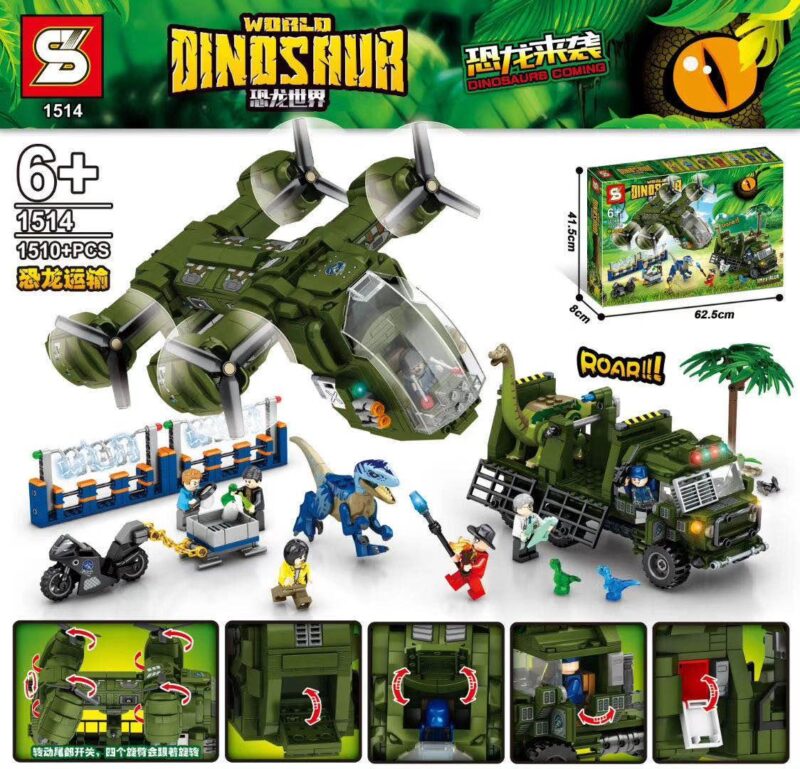 Ngay từ cái nhìn đầu tiên, quy mô của bộ xếp hình SY 1514 sẽ khiến cả mẹ và bé phải choáng ngợp. Với 1510 mảnh ghép, đây không phải là một bộ đồ chơi nhỏ bé, mà là một công trình thực sự. Trung tâm của sự chú ý là chiếc máy bay vận tải khổng lồ, được thiết kế theo phong cách của một chiếc trực thăng 4 cánh quạt hiện đại, sơn màu xanh quân đội mạnh mẽ. Bốn cánh quạt lớn có thể xoay, khoang lái trong suốt để lộ phi công bên trong, và đặc biệt, cửa khoang hàng phía sau có thể mở ra, sẵn sàng cho mọi nhiệm vụ vận chuyển. Đi kèm là chiếc xe tải chuyên dụng, cũng mang màu xanh đồng bộ, với phần thùng sau là một chiếc lồng kiên cố để áp giải những con khủng long ‘khó tính’ nhất. Bộ sản phẩm còn bao gồm một chiếc mô tô phân khối lớn cho các nhiệm vụ trinh sát nhanh, một hệ thống hàng rào điện để thiết lập khu vực an toàn, cùng 6 nhân vật và một bầy khủng long đủ kích cỡ, từ con T-Rex hung tợn, khủng long cổ dài hiền hòa đến hai chú khủng long con tinh nghịch. Mọi chi tiết đều được chăm chút tỉ mỉ, tạo nên một sa bàn sống động và chân thực đến không ngờ.