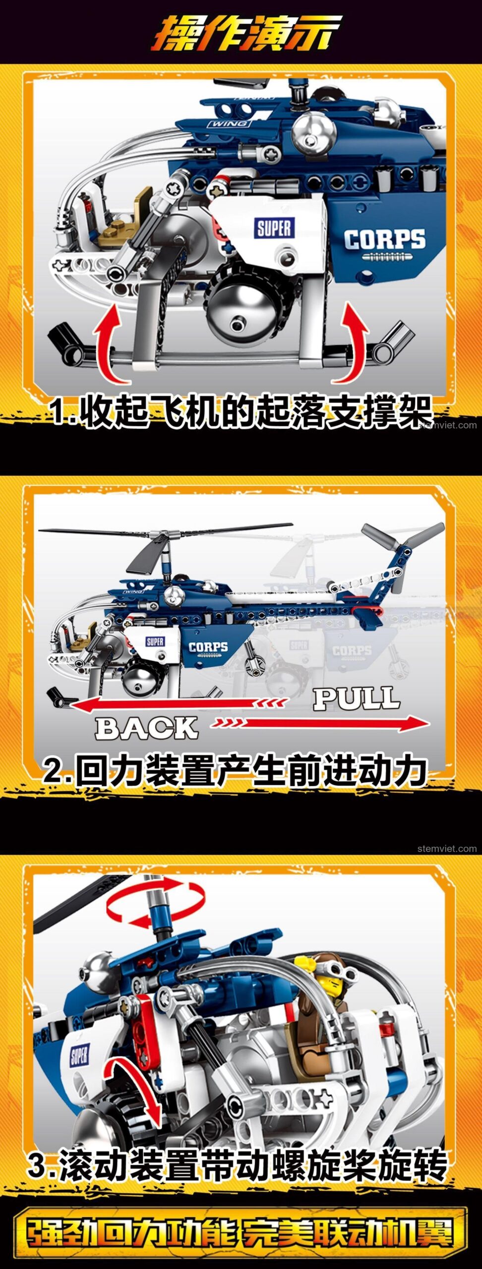 Chiếc trực thăng được trang bị động cơ kéo lùi. Bé chỉ cần kéo mô hình về phía sau trên một bề mặt phẳng, sau đó thả tay ra. Lực kéo sẽ tích trữ năng lượng và đẩy chiếc trực thăng lao về phía trước. Đặc biệt, cánh quạt cũng sẽ quay theo khi mô hình di chuyển, tăng thêm sự chân thực và thú vị.