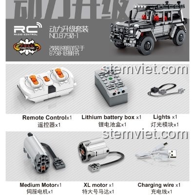 Chị chỉ cần mua thêm một bộ nâng cấp động lực có mã là 8790-1. Bộ này đã bao gồm đầy đủ mọi thứ cần thiết: 2 động cơ, 1 hộp pin sạc Lithium, 1 điều khiển từ xa, 1 module đèn và dây sạc USB. Việc lắp đặt cũng được hướng dẫn cụ thể trong sách đi kèm.