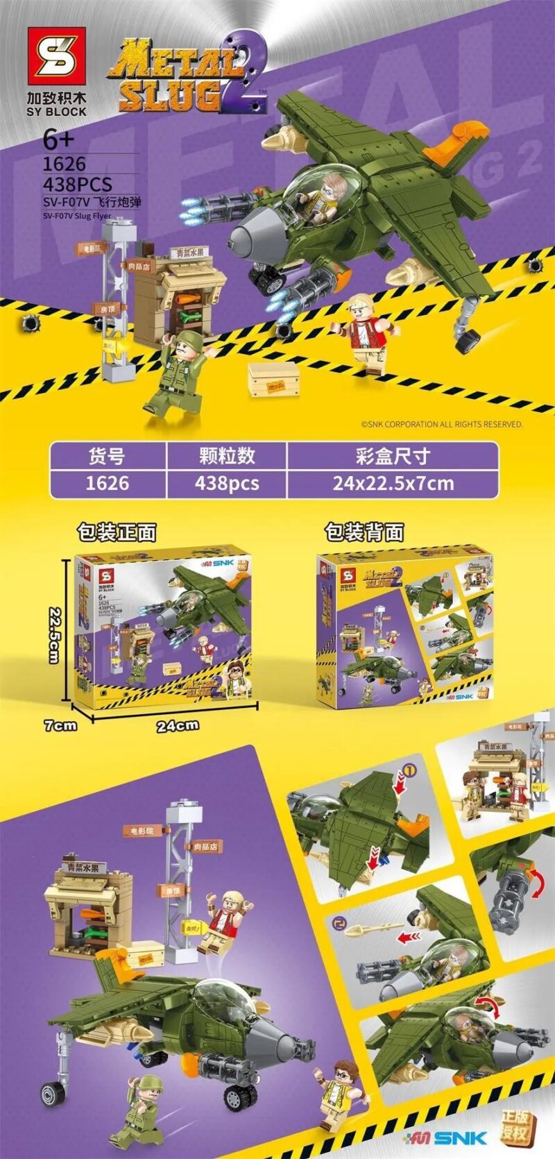 Bộ lắp ghép SY BLOCK 1626 tái hiện chi tiết máy bay SV-F07V Slug Flyer với 438 mảnh ghép, mang đến trải nghiệm lắp ráp chân thực và mô hình hoàn chỉnh có thể dùng để trưng bày hoặc nhập vai.
