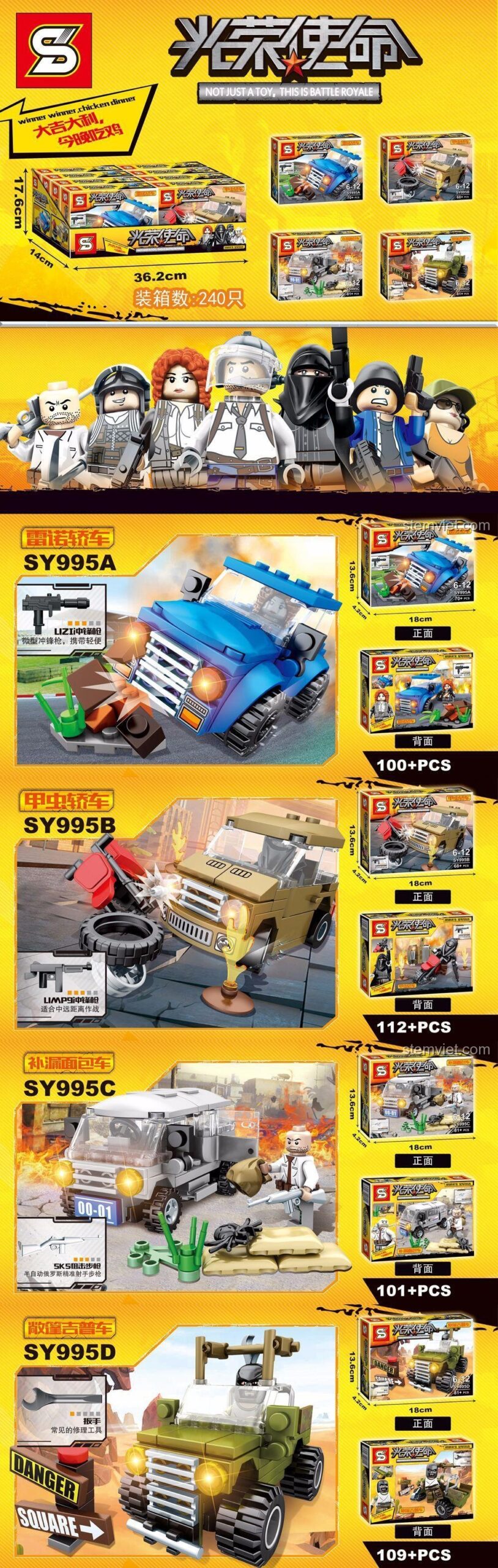 Bộ sản phẩm SY995 là một bộ sưu tập 4 trong 1, bao gồm 4 hộp nhỏ riêng biệt. Mỗi hộp lắp ráp được một mẫu xe khác nhau (Jeep, Xe Con Bọ, Xe Van, Xe Sedan) và đi kèm 1 minifigure nhân vật game PUBG cùng vũ khí. Tổng cộng bạn sẽ có 4 xe và 4 nhân vật.