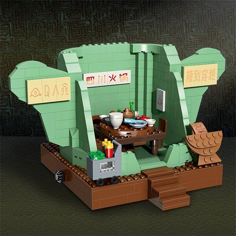 Đặc biệt, các chi tiết nhỏ như biển hiệu “四川火锅” (Lẩu Tứ Xuyên) hay các họa tiết trang trí trên tường đều được mô phỏng một cách khéo léo, mang đến cái nhìn chân thực về một không gian văn hóa đặc trưng. Bộ lắp ghép này không chỉ là đồ chơi mà còn là một tác phẩm nghệ thuật thu nhỏ, giúp bé phát triển khả năng quan sát và cảm nhận thẩm mỹ.